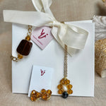 Amber Set: Complete your look with this set. Features include amber crystal stud earrings, a stainless steel chain necklace with amber beads and fresh water pearl, and a brown toned bracelet. Elevate your style with natural elements.