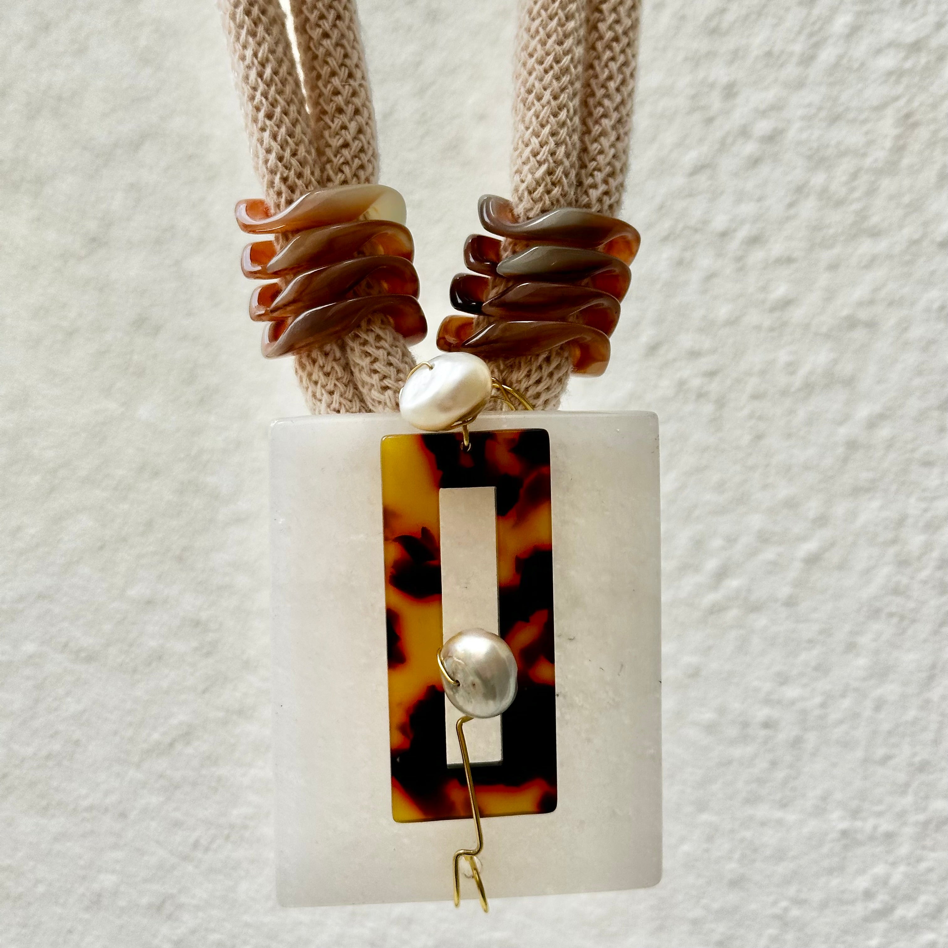 This Amber & Stone Statement necklace combines a white flat stone, tortoise resin bead, and fresh water pearl for a unique and eye-catching piece. Make a statement with this elegant and versatile necklace that's perfect for any occasion.