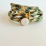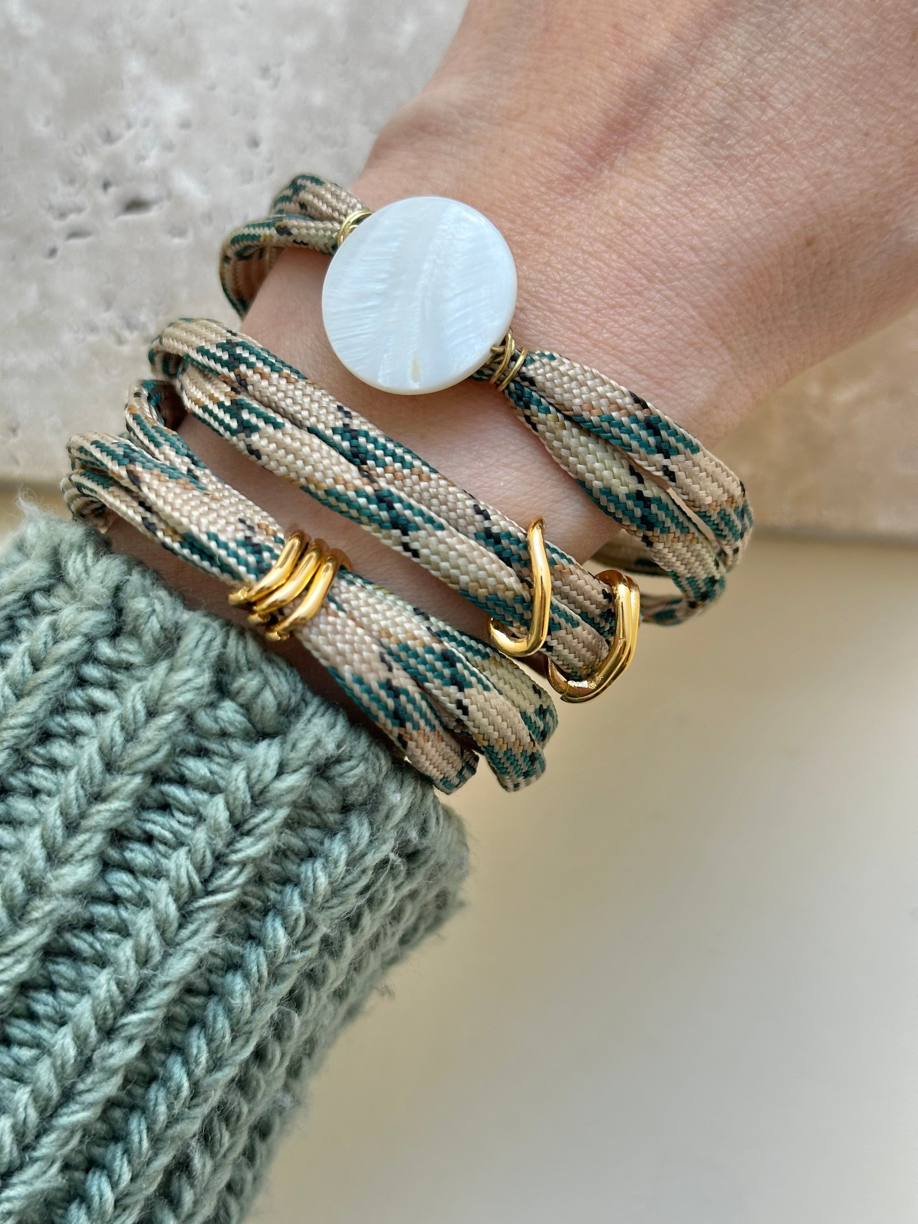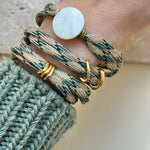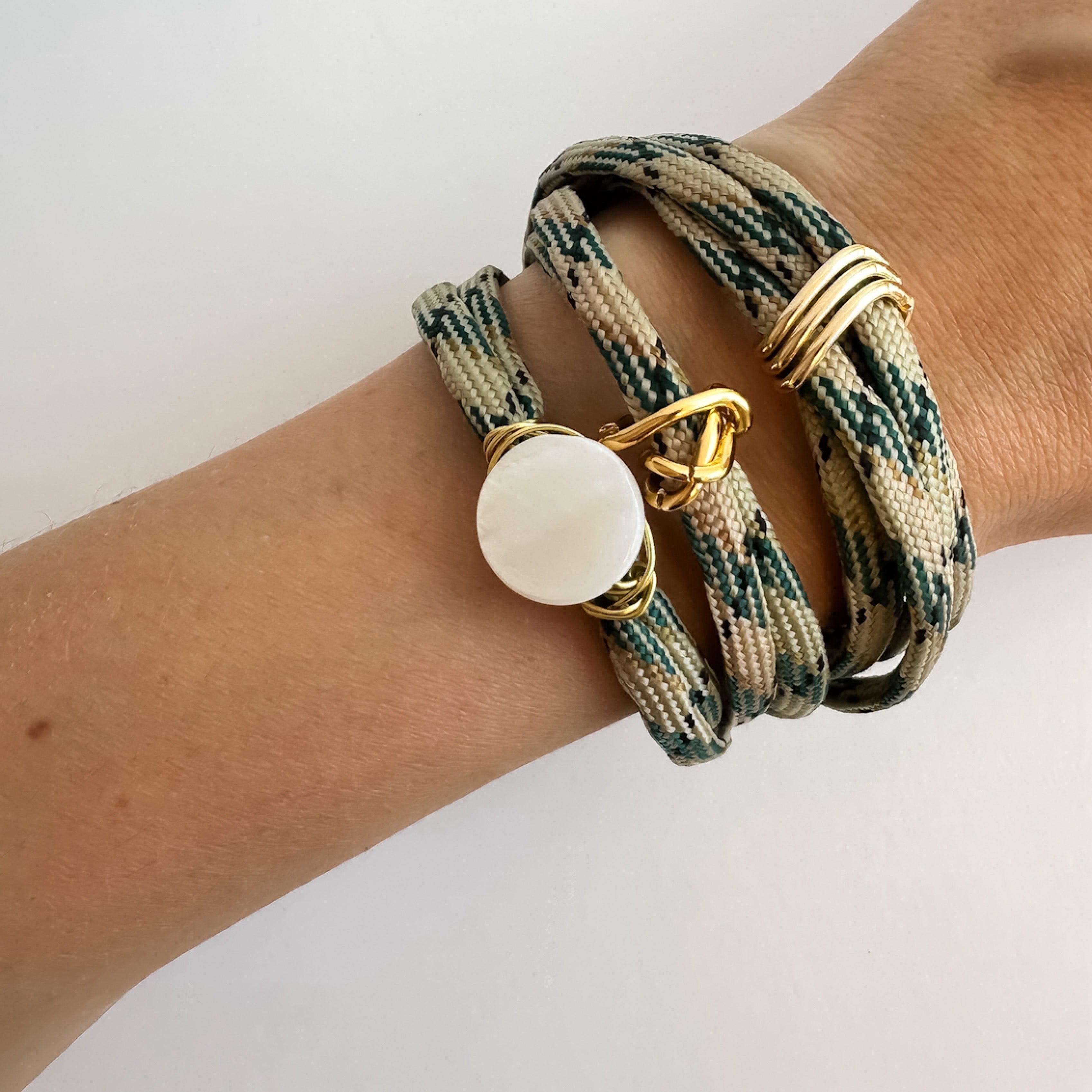Wrapover bracelet, army green & beige patterned cord, 4 strands combined with a mother of pearl. Bracelet can be adjusted