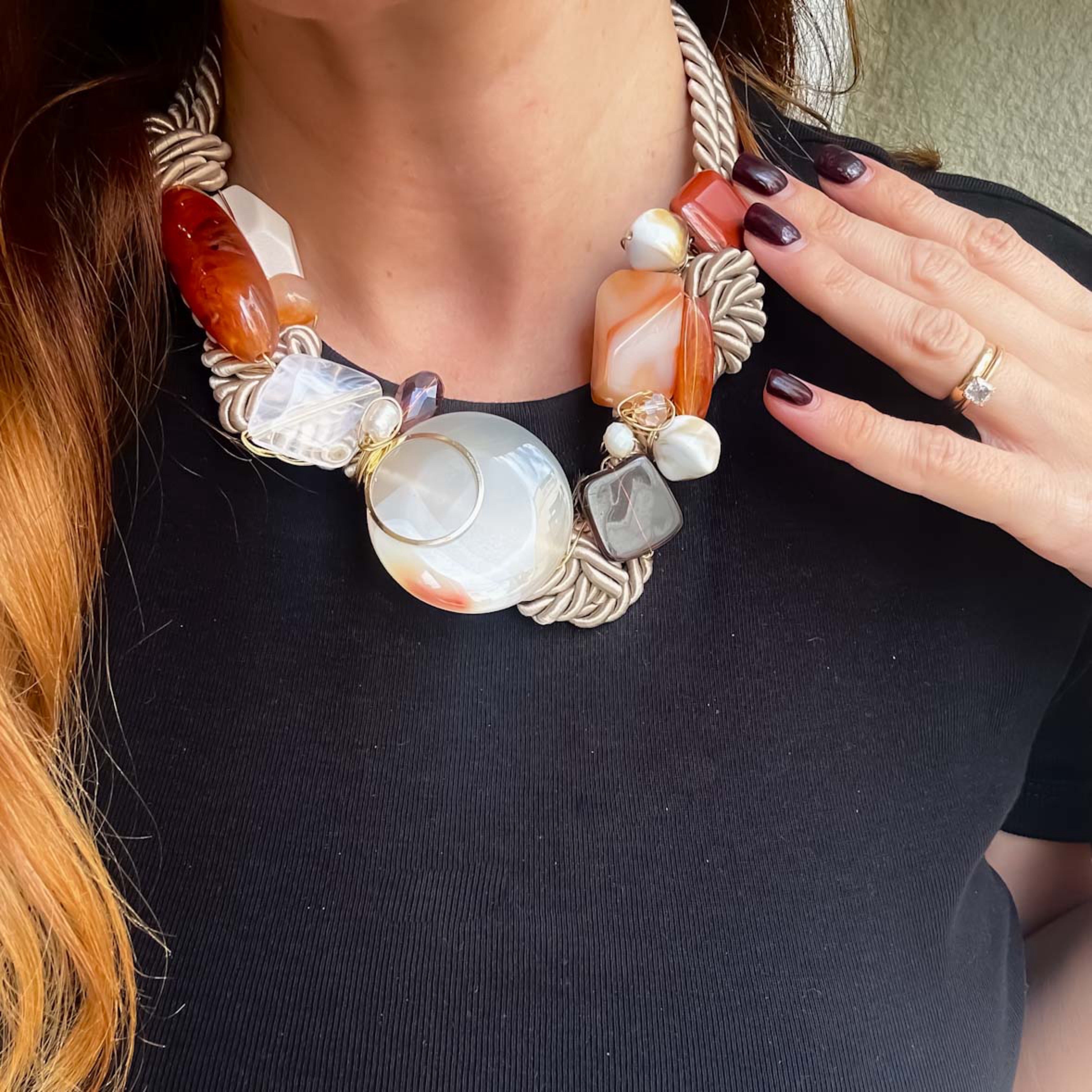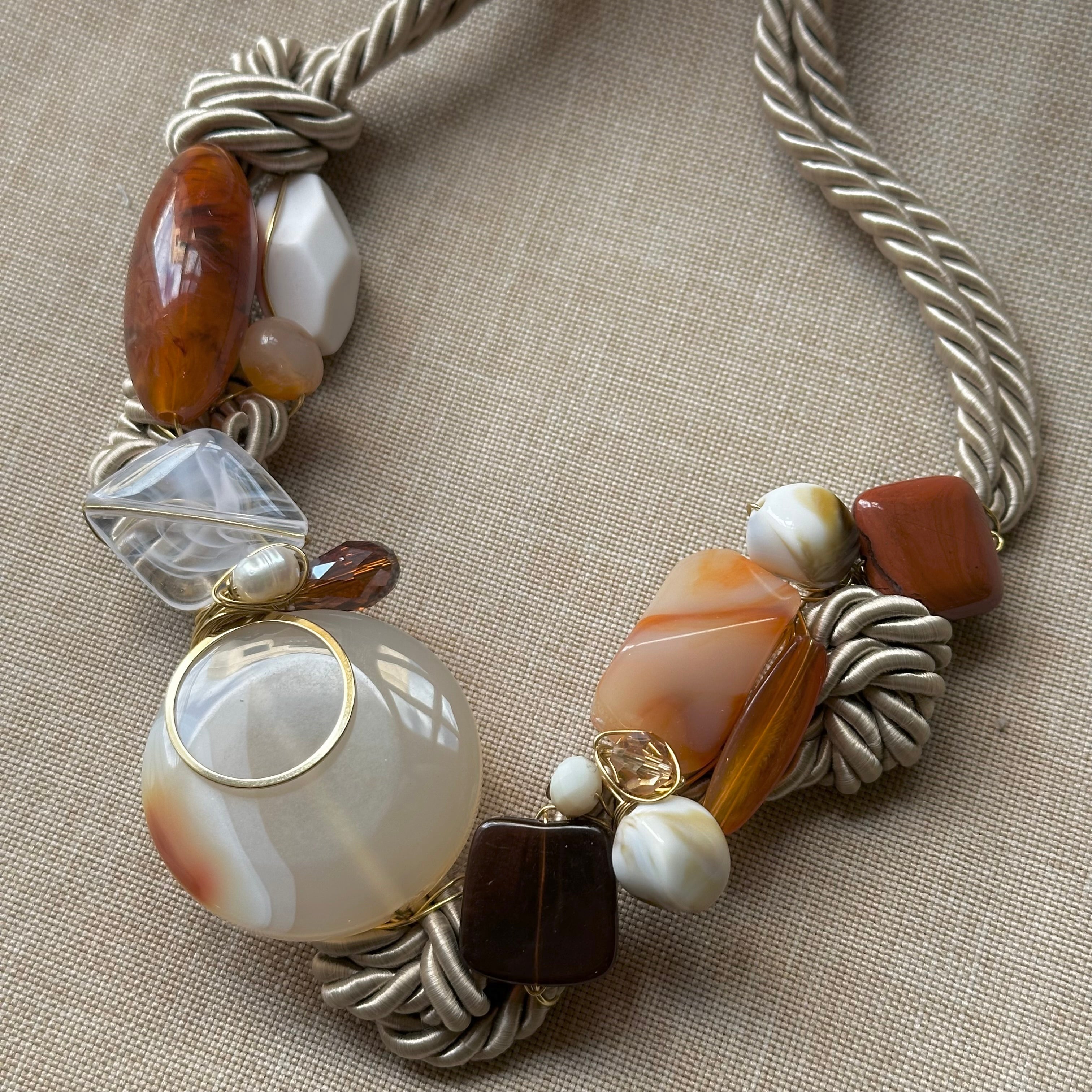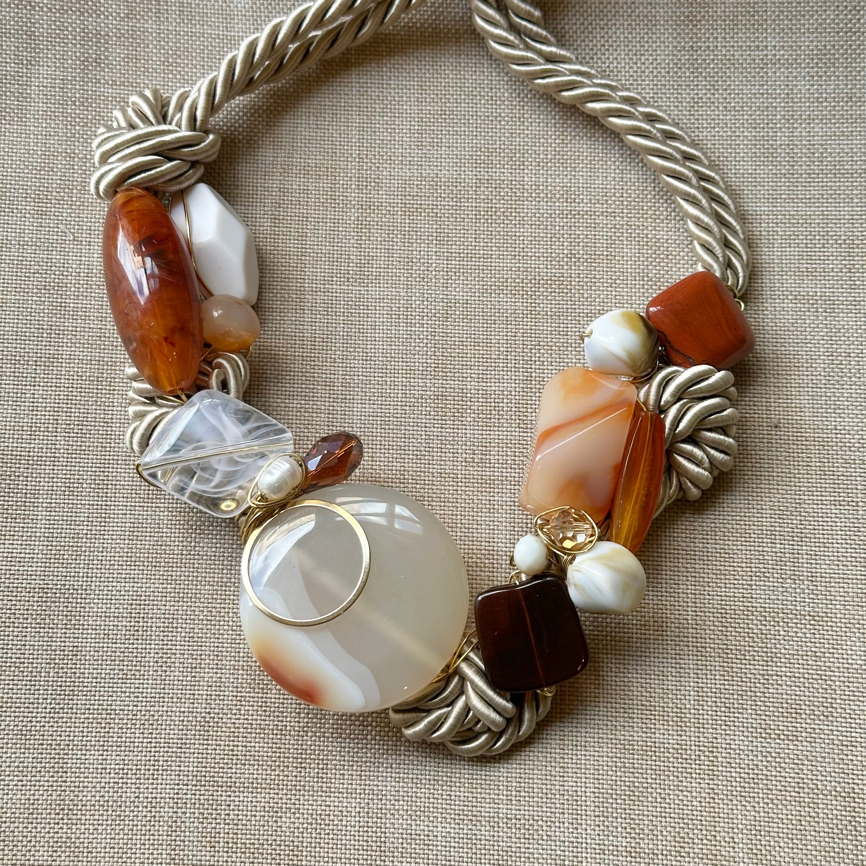 This Autumn Agate Statement necklace features warm amber and brown tones on a taupe rope, adorned with a unique agate stone. The one-off design sits elegantly on the collar bone, making it a stunning addition to any outfit. Exude sophistication and style with this hand-crafted piece.