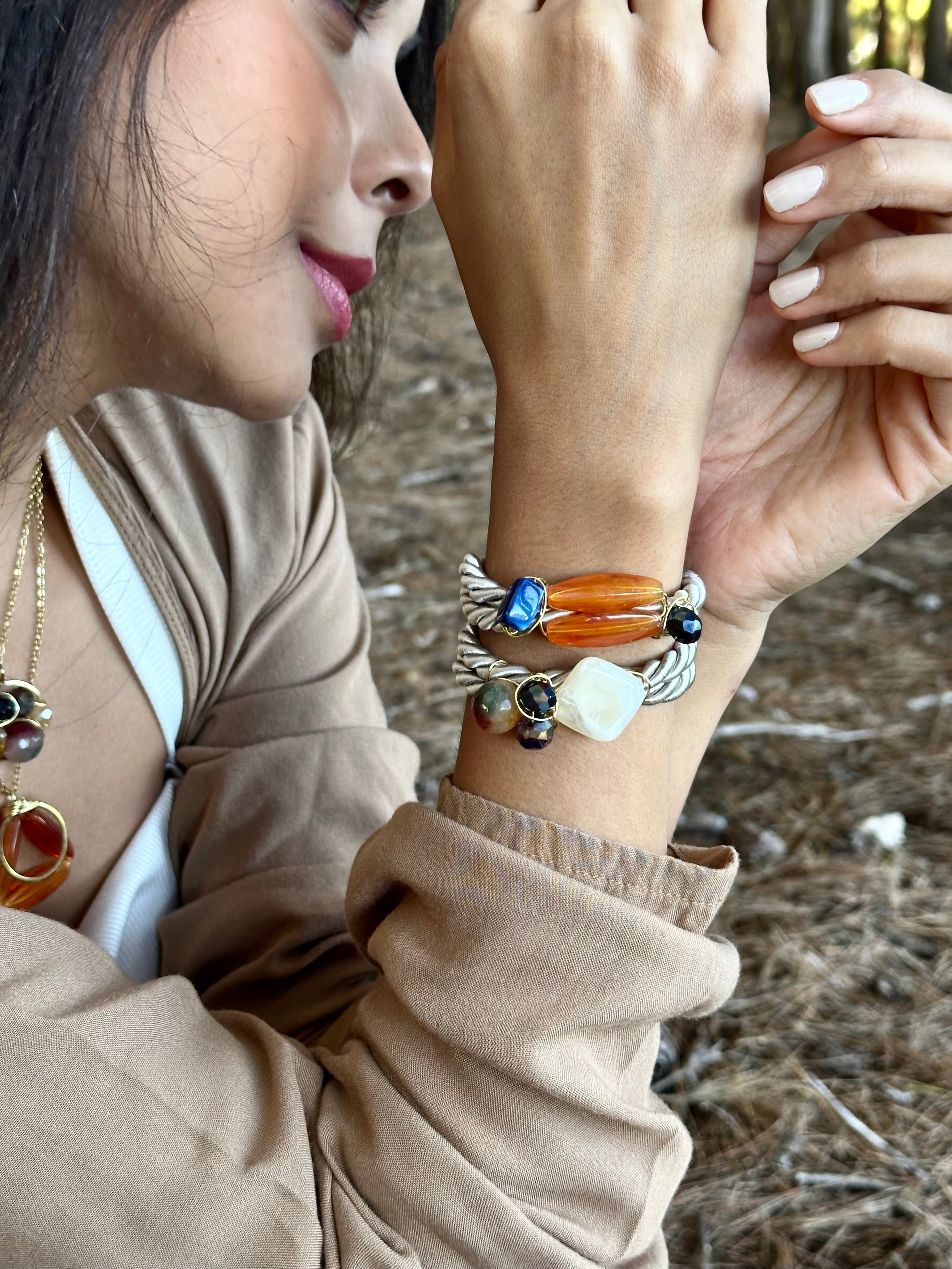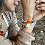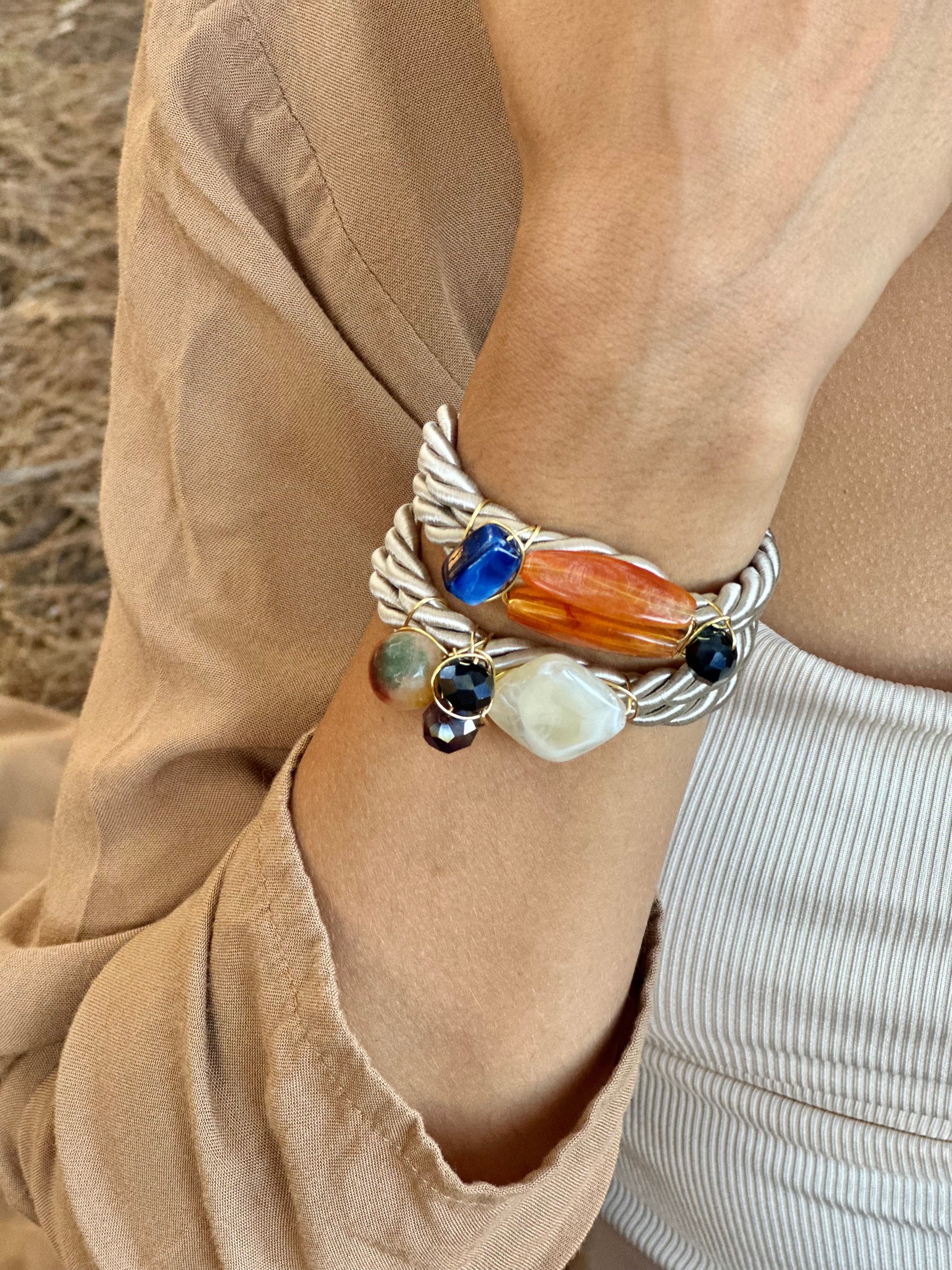 Elevate your autumn wardrobe with our Echo Wrap-over. With a stunning combination of deep blue and amber tones, this wrap-over also features a green toned mossy semi precious stone taupe rope. Make a statement with this unique and stylish piece.