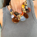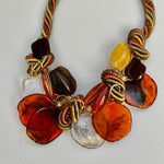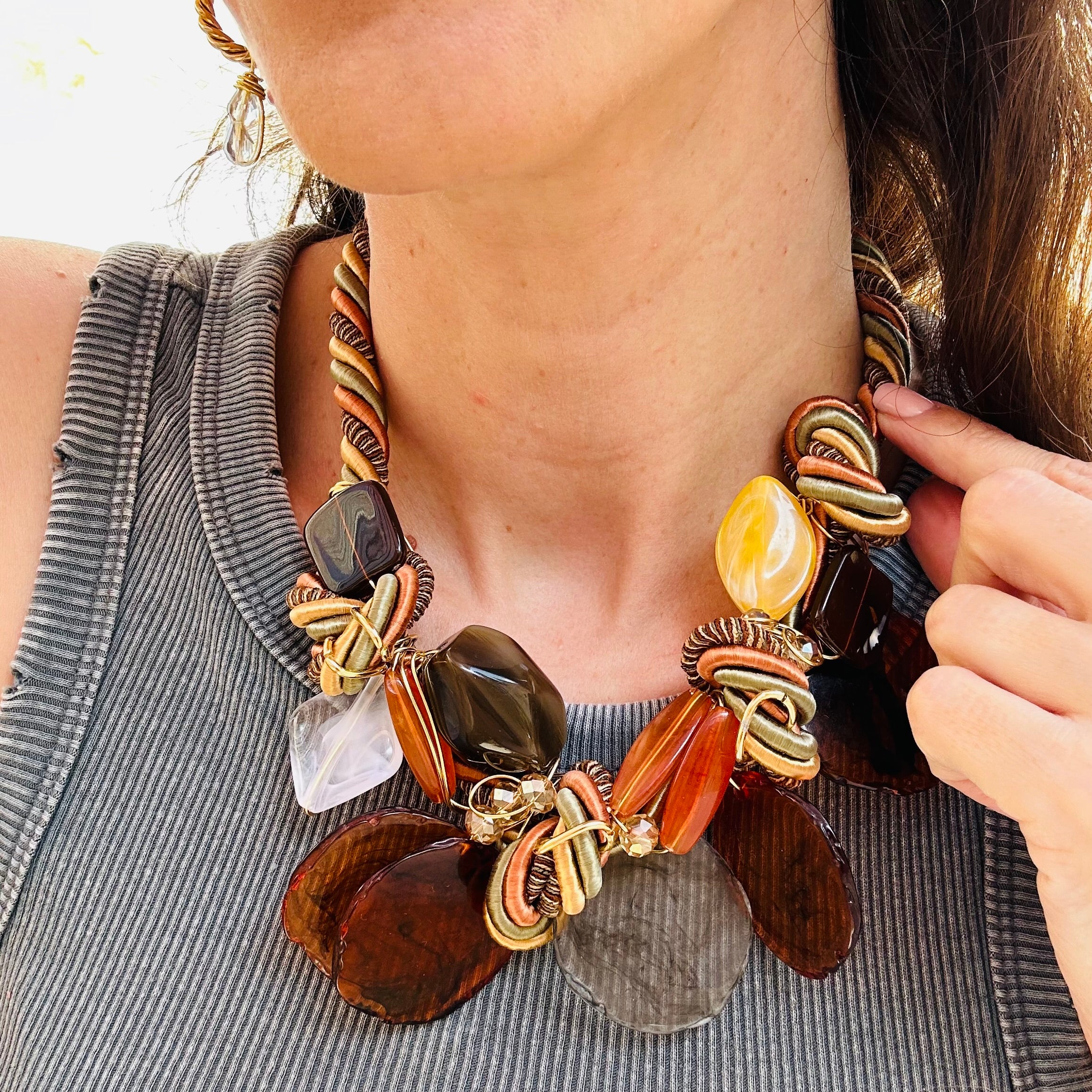 Discover your autumn mood with this unique statement piece. Hand-crafted with a combination of rich autumn hues, this one-of-a-kind necklace sits elegantly on your collarbone, making it a must-have accessory for the season. Add a touch of personality to any outfit with this beautiful and versatile piece.