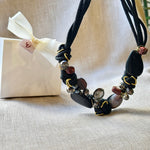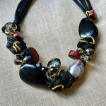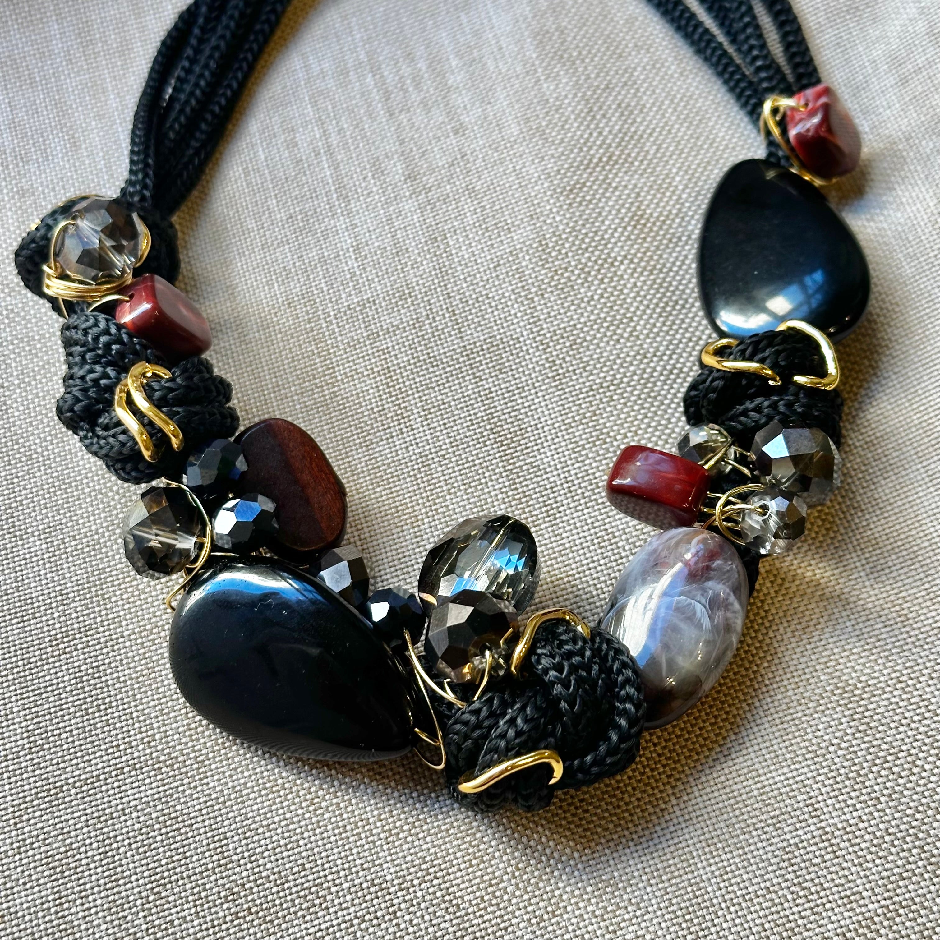 Add a touch of elegance to your outfit with Black Goddess. This black statement necklace features intricate black rope, crystals, and beads with bold red accents. The adjustable length lets you wear it comfortably on your collar bone. Elevate your style with this luxurious piece.