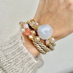 The Bloom & Blush Wrapover features a soft pink and white color palette complemented by a pink quartz heart on a taupe base. This design not only enhances aesthetic appeal but also provides a versatile accessory option suitable for various occasions, ensuring both elegance and comfort.