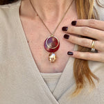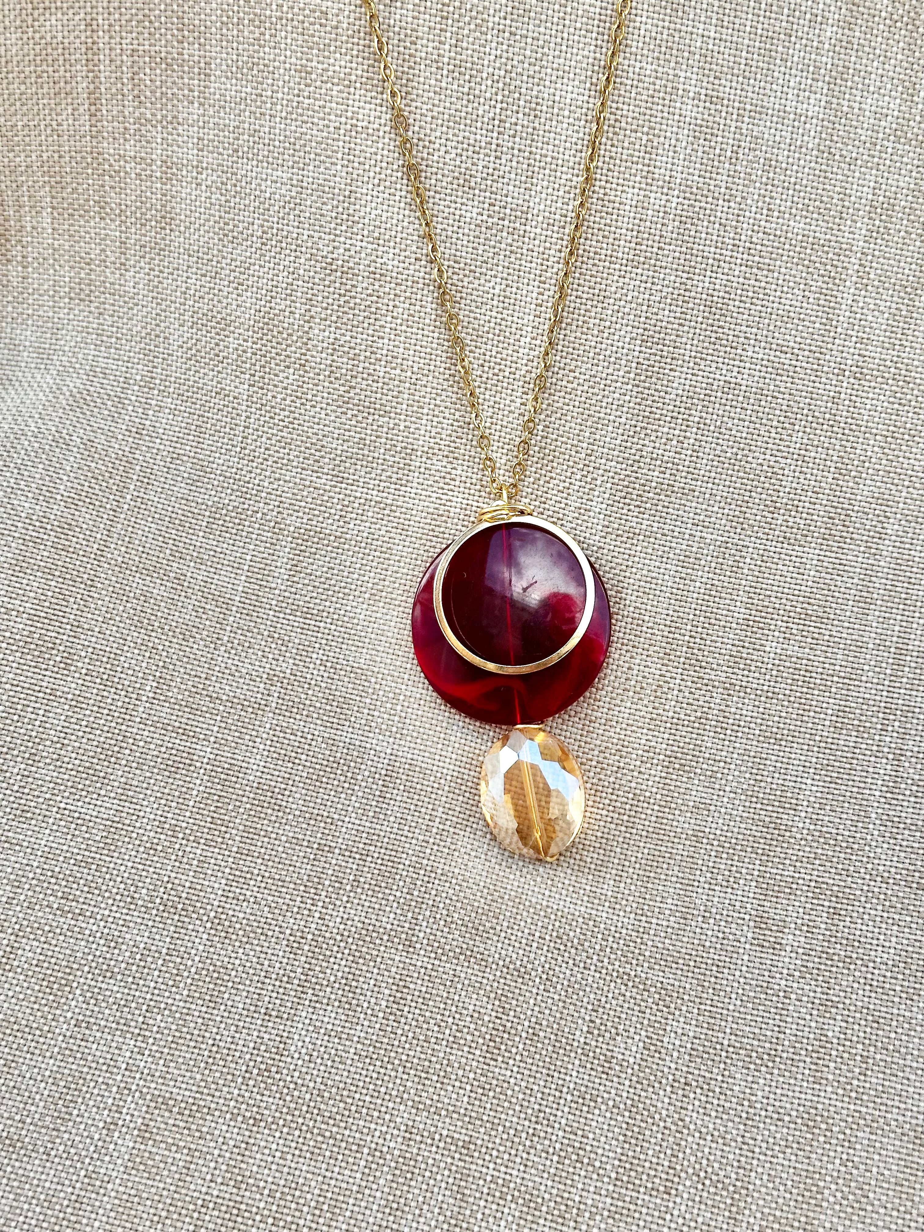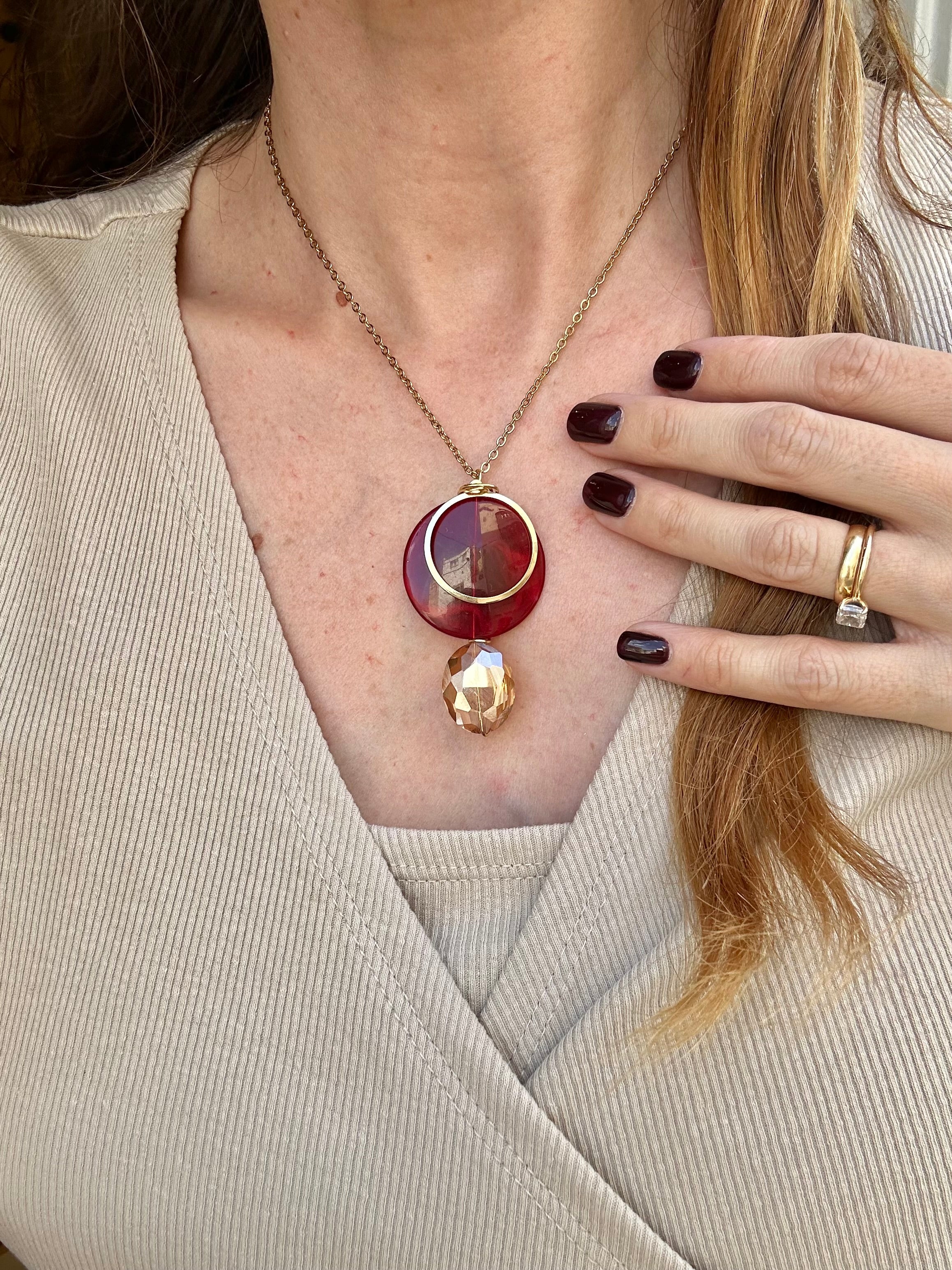 Enhance your style with our Cherry Red Disc Pendant Necklace. This elegant necklace features a stunning combination of a deep red disc pendant and a sparkling champagne crystal on a durable stainless steel chain. With a length of 38cm and 6cm extension, this necklace will add a touch of sophistication to any outfit.