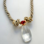 This statement necklace features a clear drop crystal on a taupe rope, paired with a stunning cherry red crystal necklace.