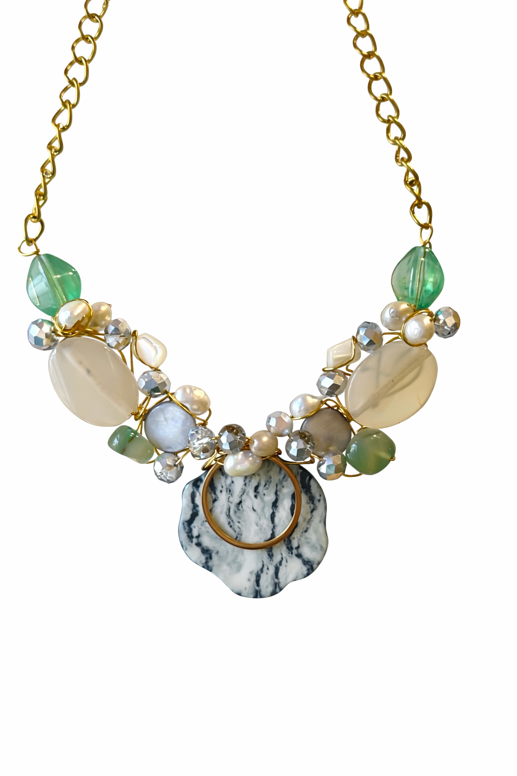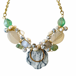 The Forest Goddess necklace features a unique blend of forest hues, including greens, cream, and neutral tones. This one-of-a-kind piece enhances your aesthetic with its natural color palette, suited for diverse outfits. Its artisanal design ensures that it stands out while maintaining a sophisticated elegance.