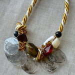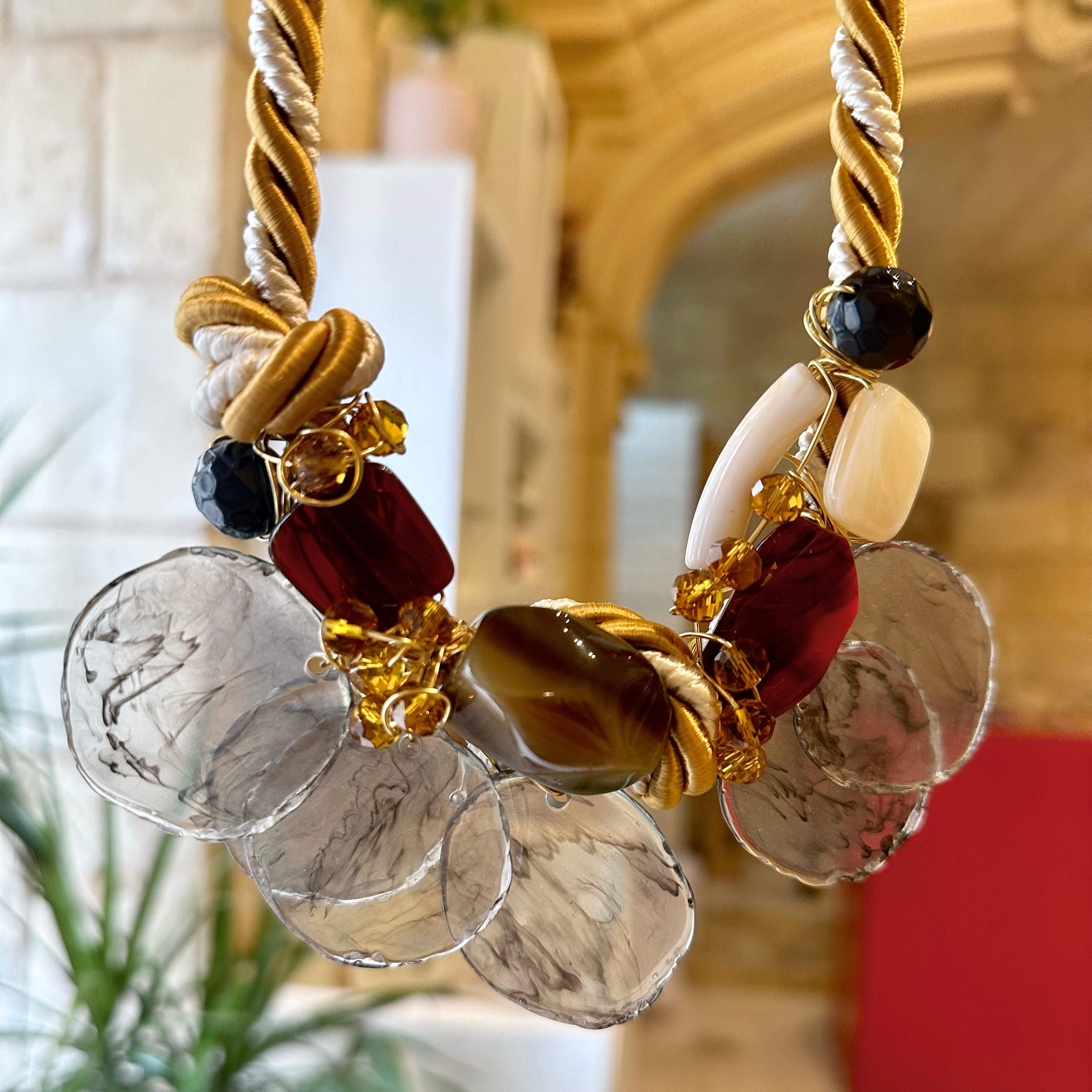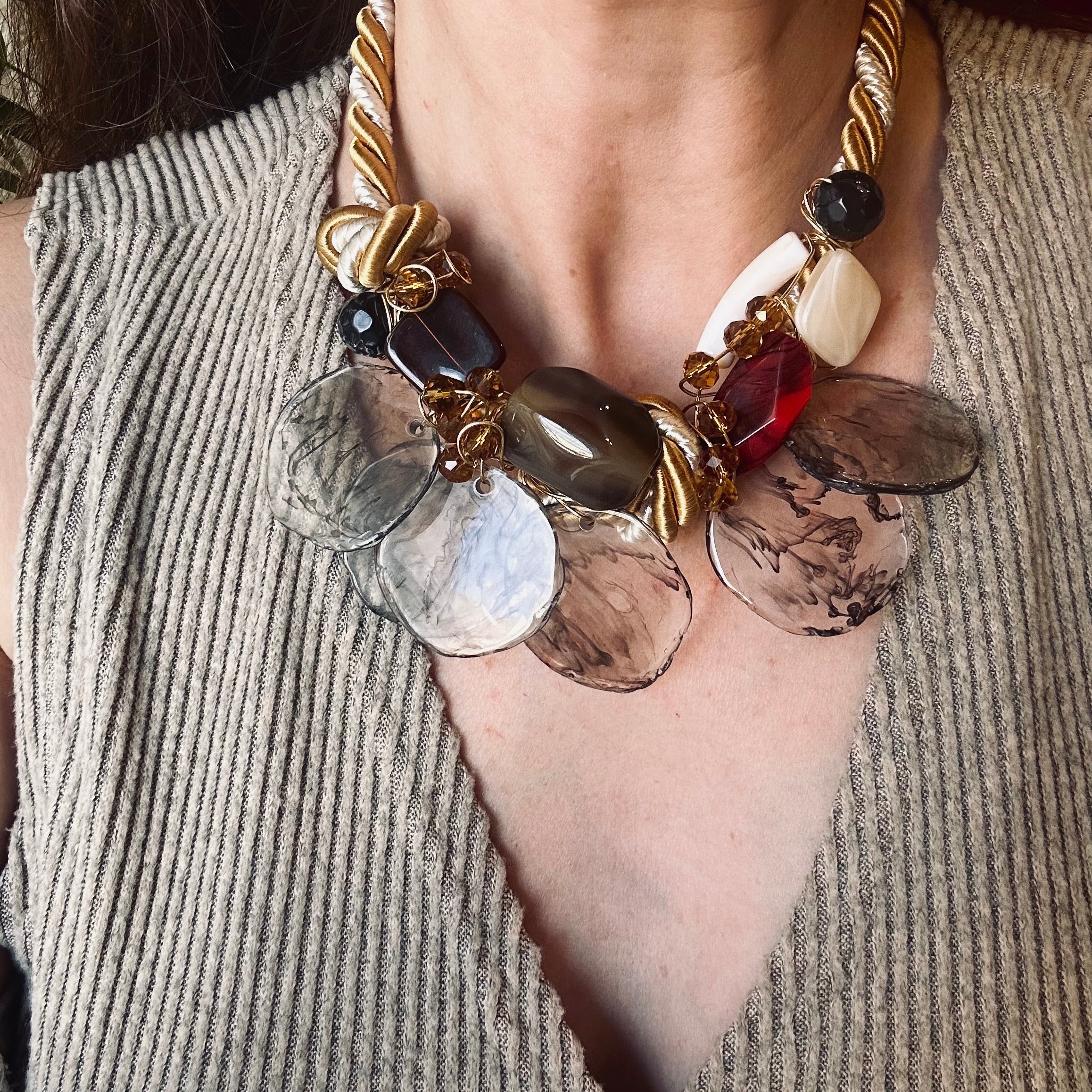 This Golden Hour Statement necklace combines a striking two-toned rope with subtle black, red, and neutral touches. Perfect for showcasing on your collar bone, it adds a touch of elegance and sophistication to any outfit. Make a statement with this versatile and eye-catching piece.
