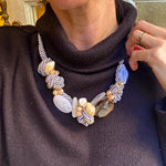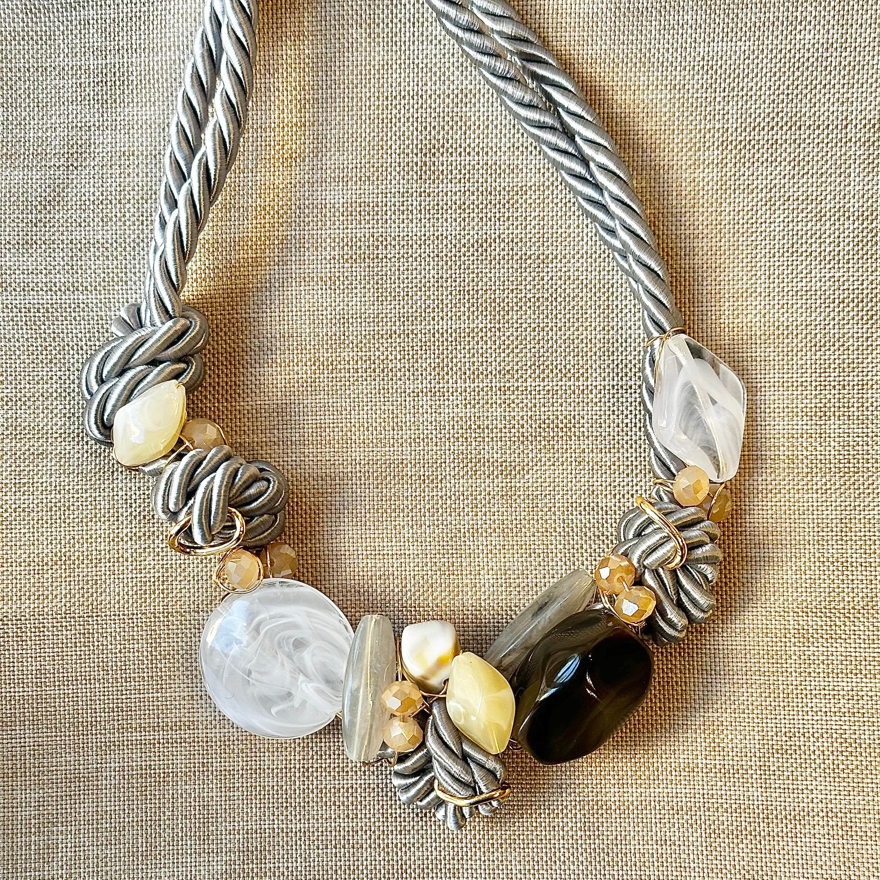 Crafted with a combination of grey rope and neutral toned shades, this statement necklace is designed to sit perfectly on your collar bone. The short length adds a touch of sophistication to any outfit, making it a versatile accessory for any occasion.