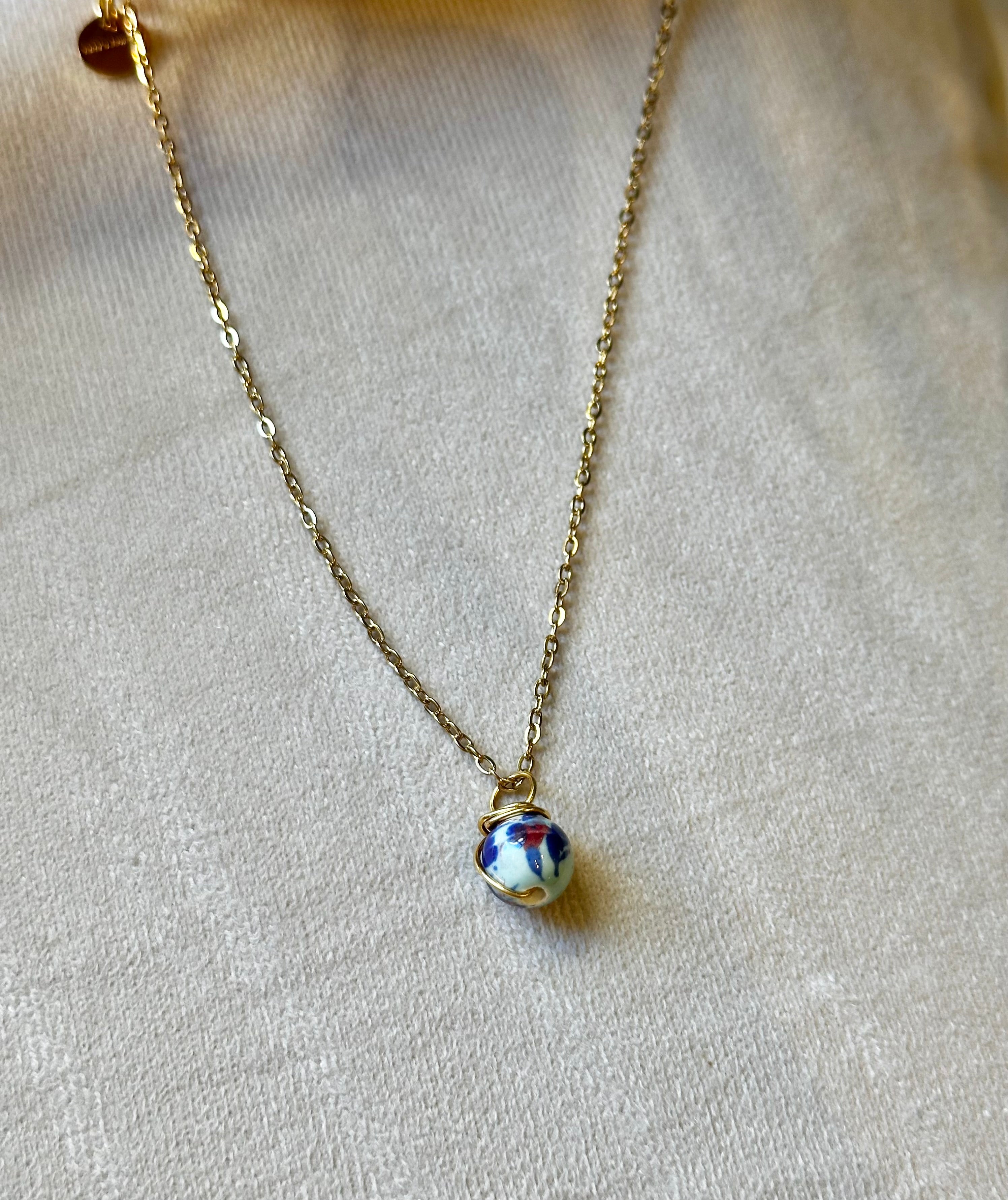 This Mediterranean Necklace features a short stainless steel chain, measuring 38cm with a 5cm extension link. The chain is combined with a ceramic painted bead, adding a touch of elegance to any outfit. Perfect for those seeking a simple yet stylish accessory with durability and versatility.