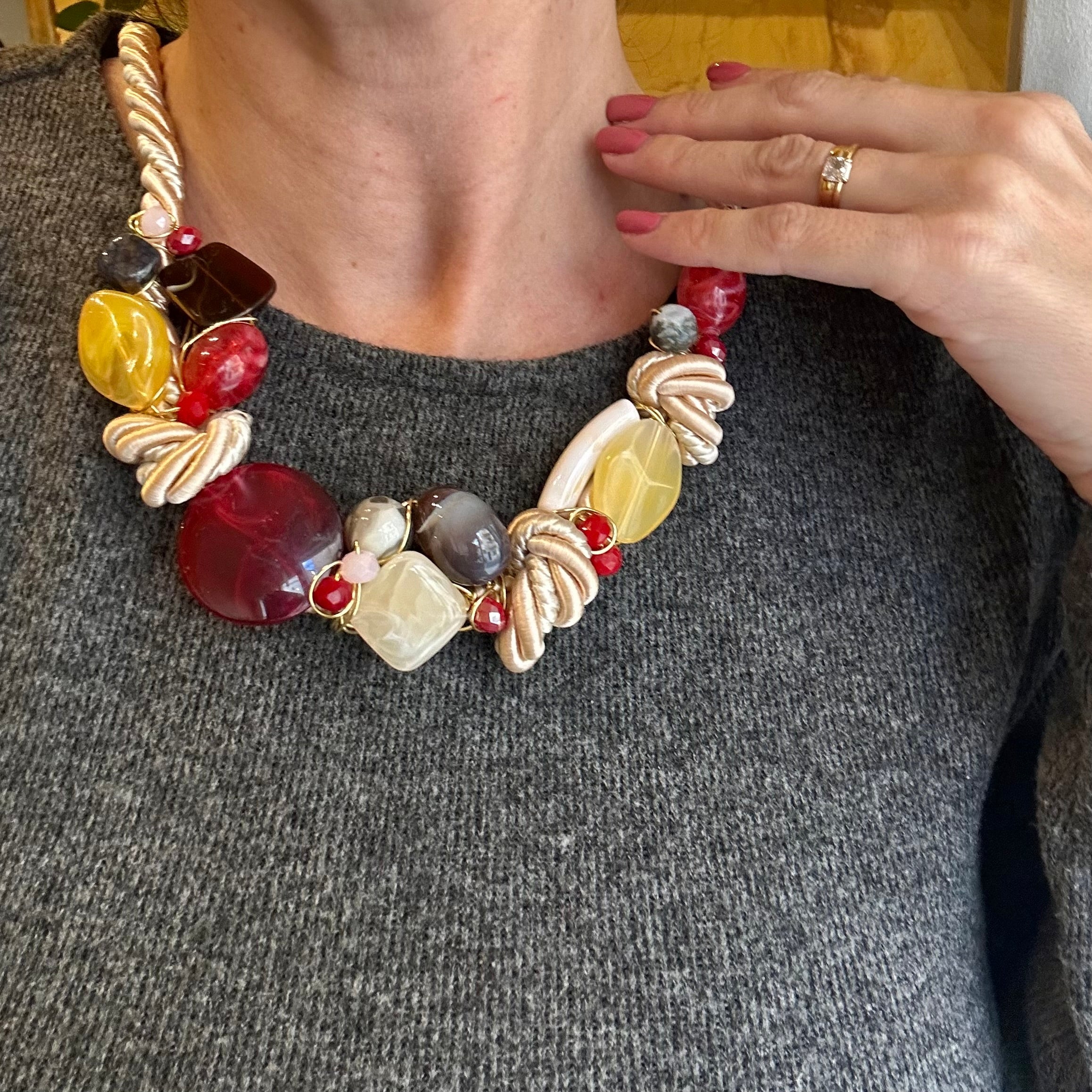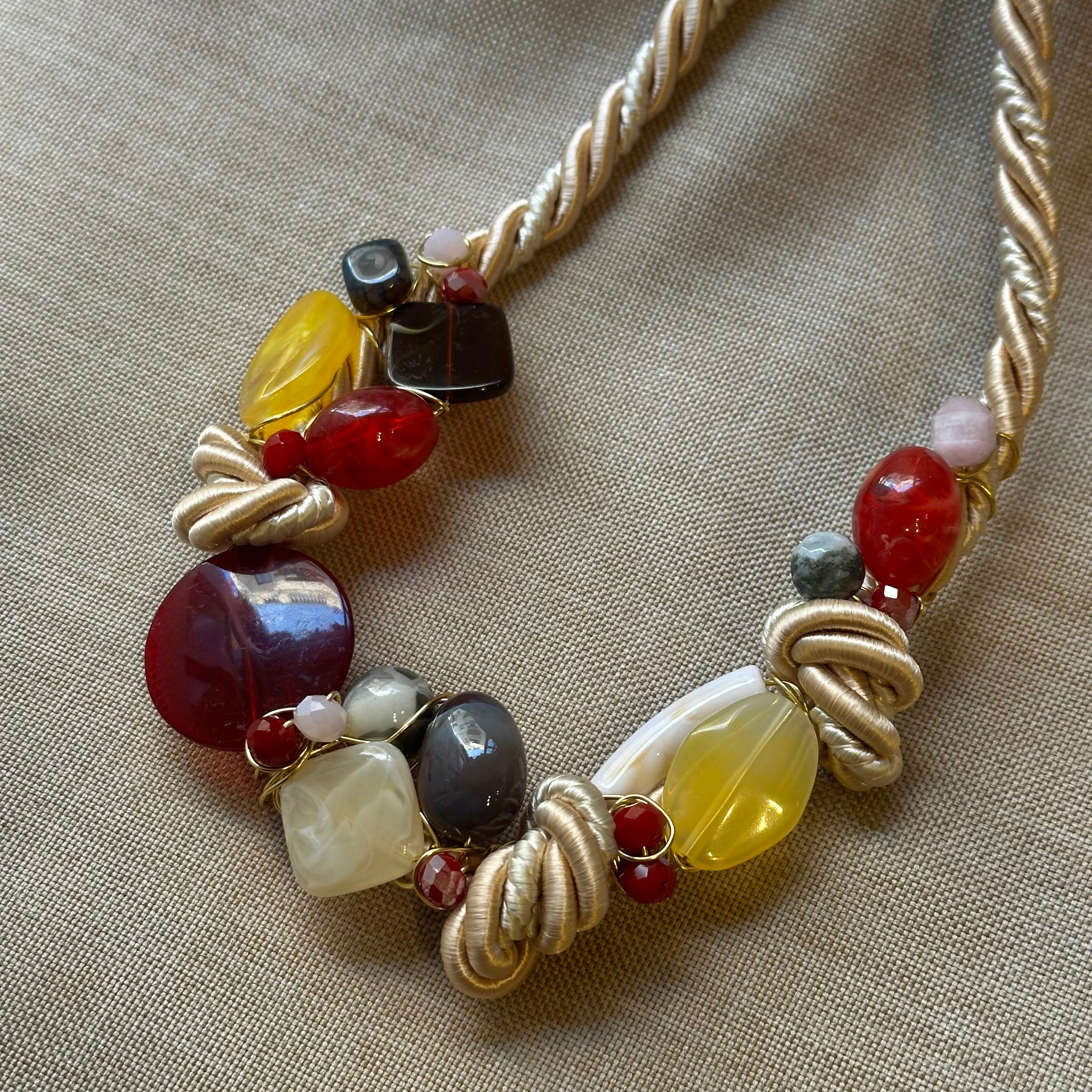 Elevate your look with our Merry Red & Yellow Statement necklace. Featuring a striking combination of red, yellow, and neutral shades, this statement piece will add a bold pop of color to any outfit. Perfect for making a statement and showing off your unique style.