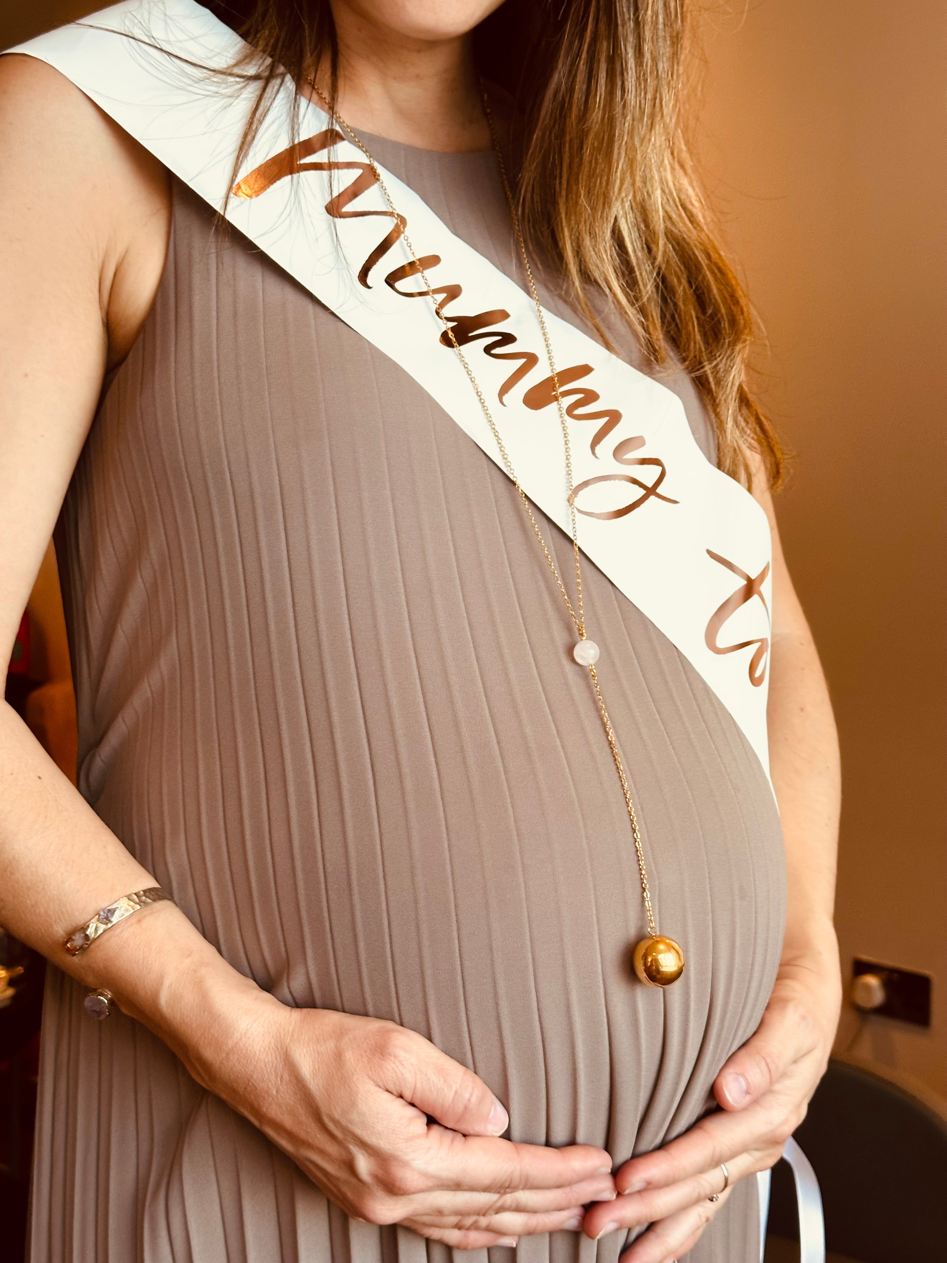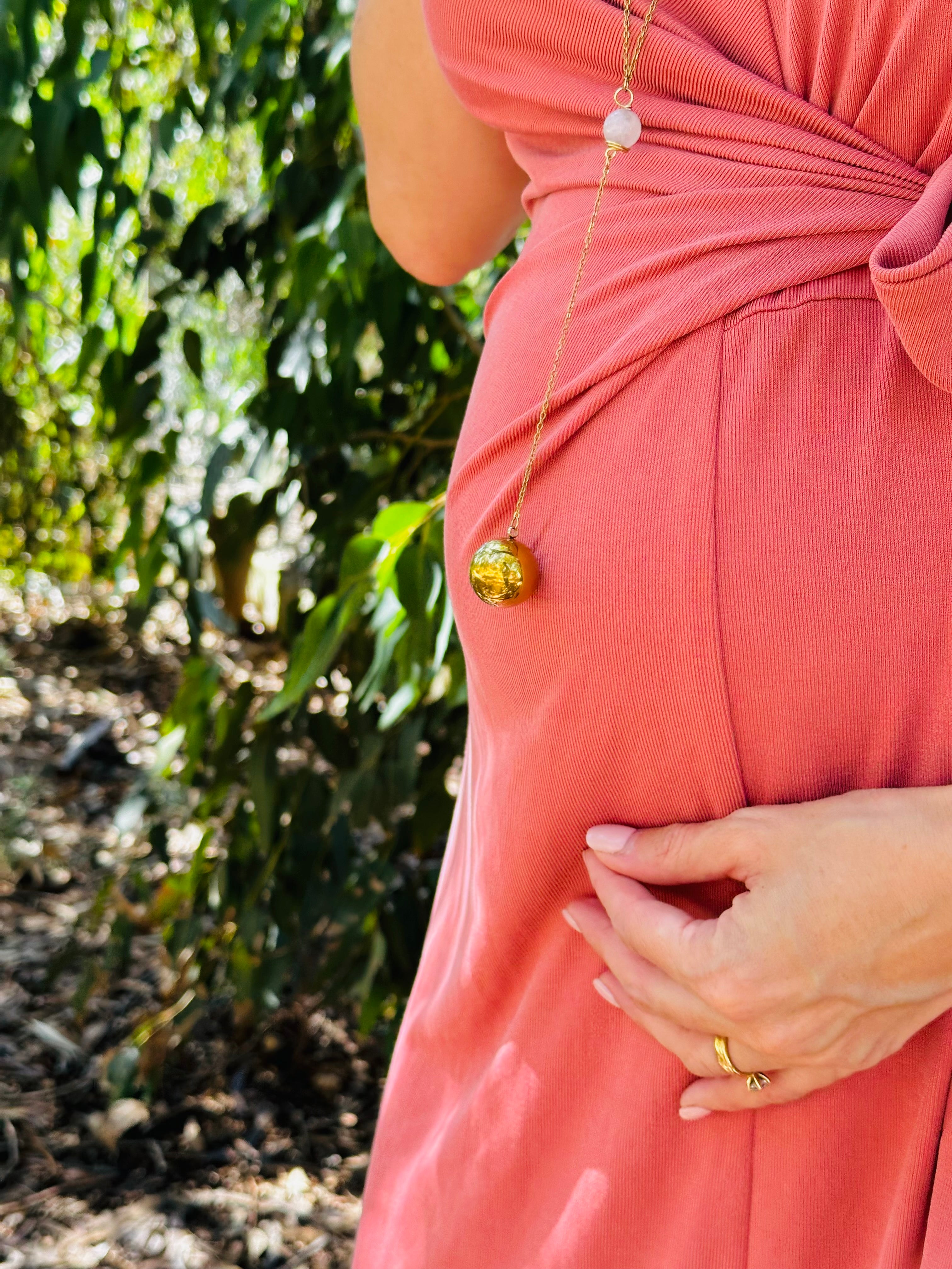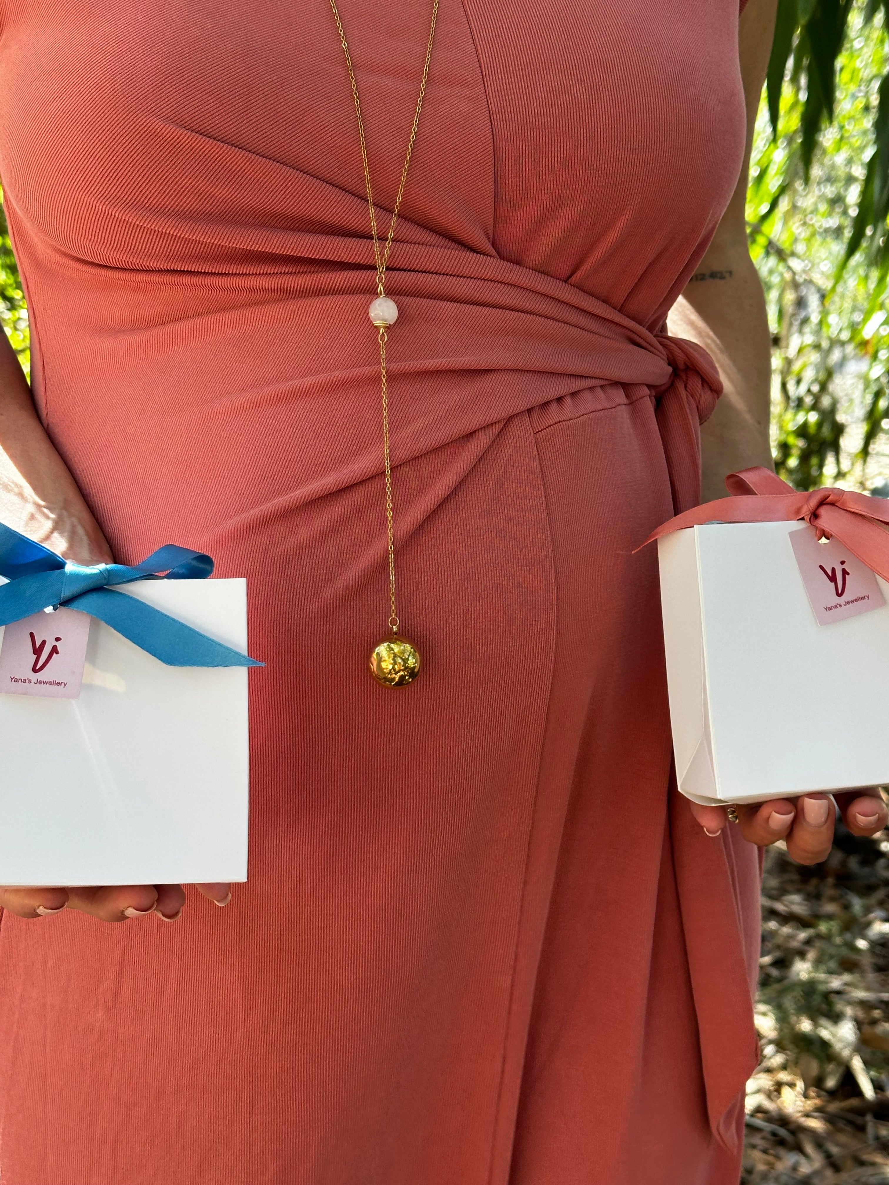Experience the soothing sound and unconditional love of our Pregnancy Bola necklace. Made with a stainless steel chain and a pale rose quartz stone, it can be adjusted for comfort. The ball chime within the necklace also calms your baby during pregnancy.