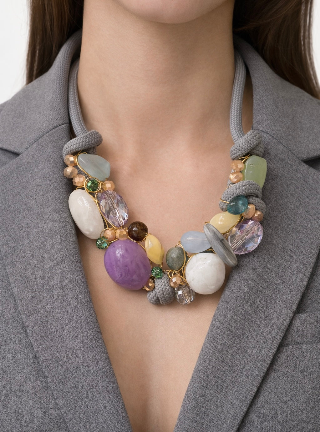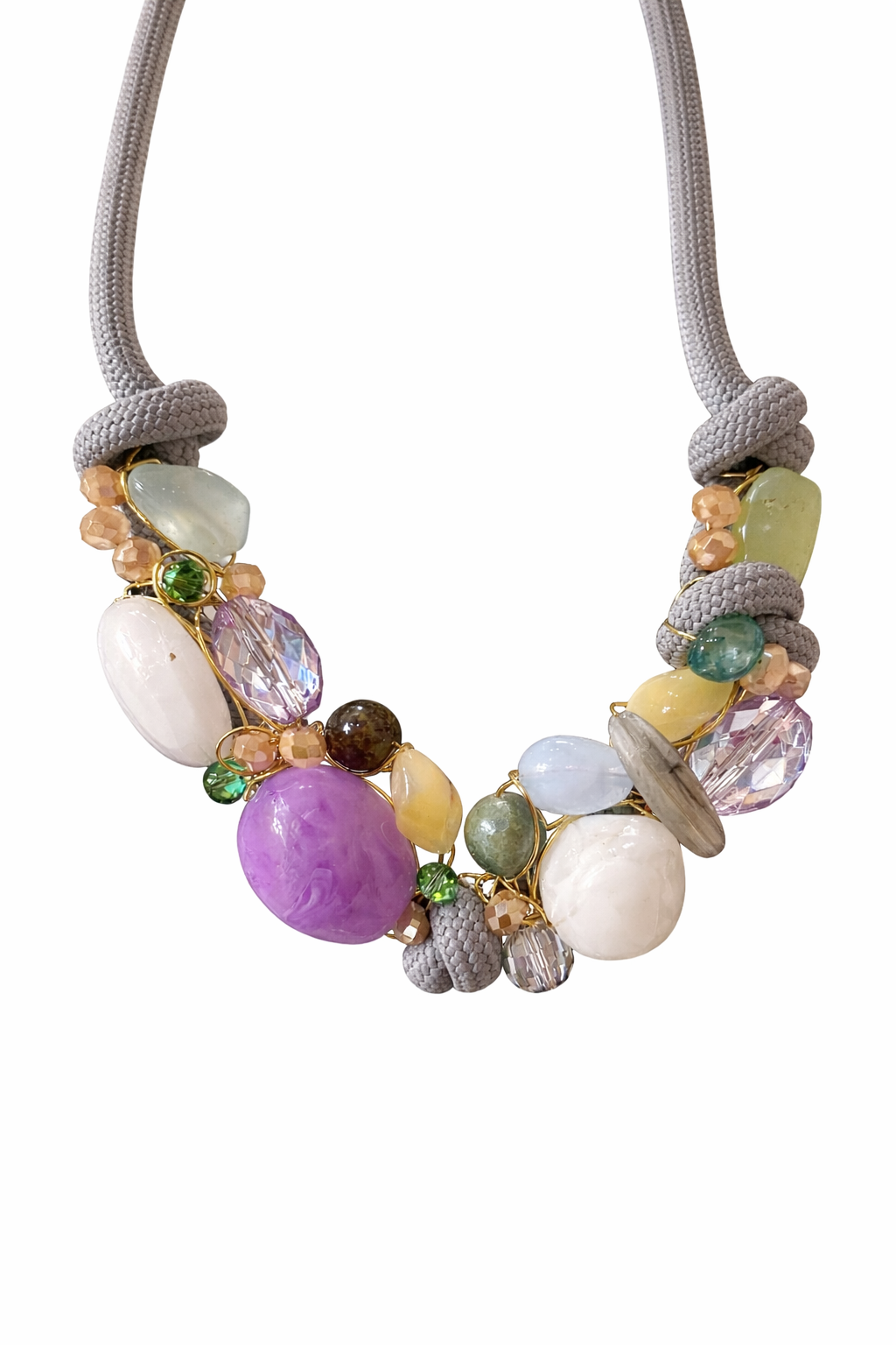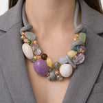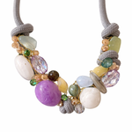 The Purple Heaven Statement necklace features a harmonious blend of purple, powder blue, beige, and jade green beads, elegantly arranged on a grey rope. Designed to sit comfortably at the collarbone, this necklace offers a visually striking accessory that enhances any outfit, providing a sophisticated touch to your ensemble.