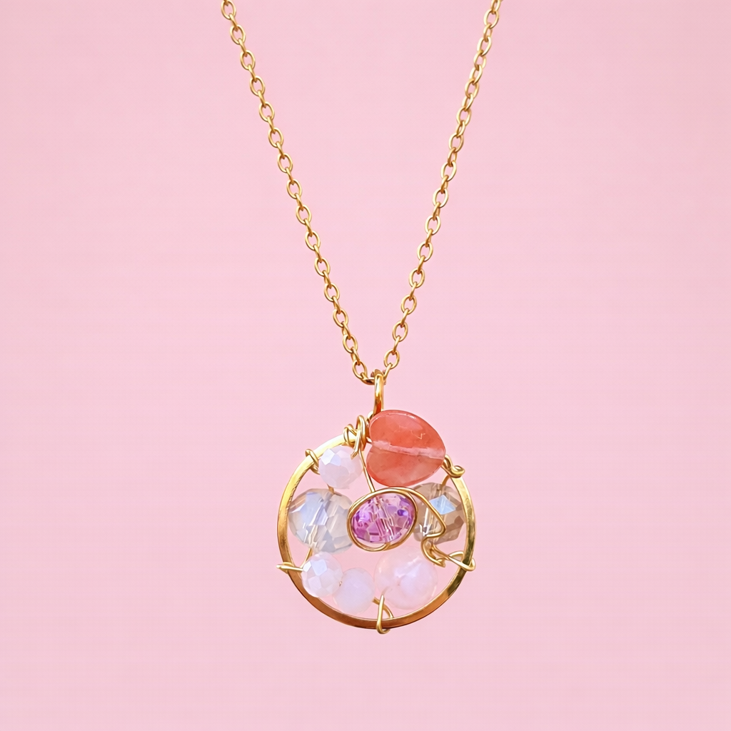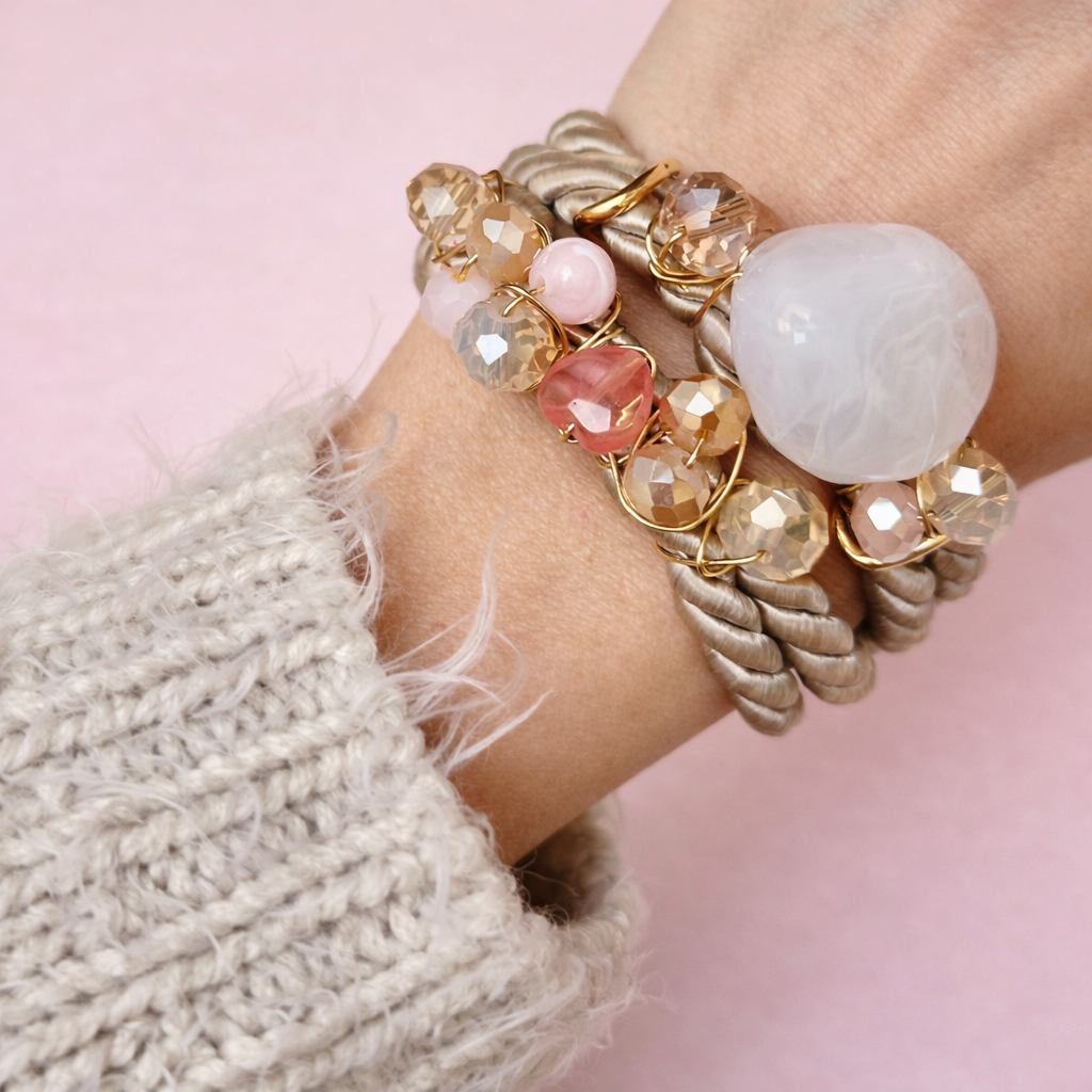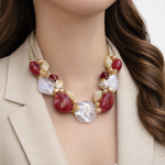 The Red & White Statement is a distinctive accessory featuring a combination of red and white tones on a taupe rope, accented with peach crystals. This piece enhances visual contrast and can complement a variety of outfits, providing a sophisticated touch to casual and formal attire alike.