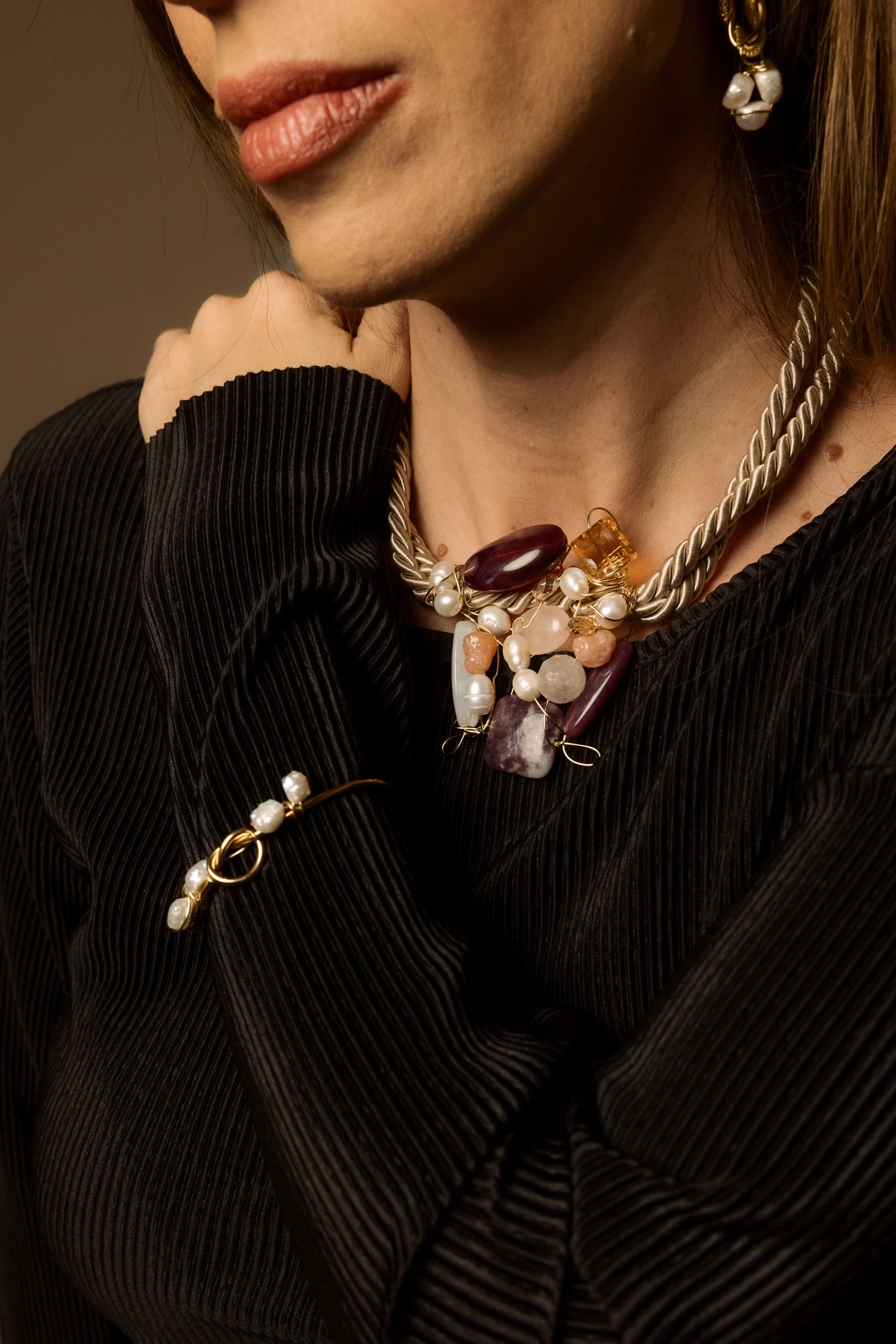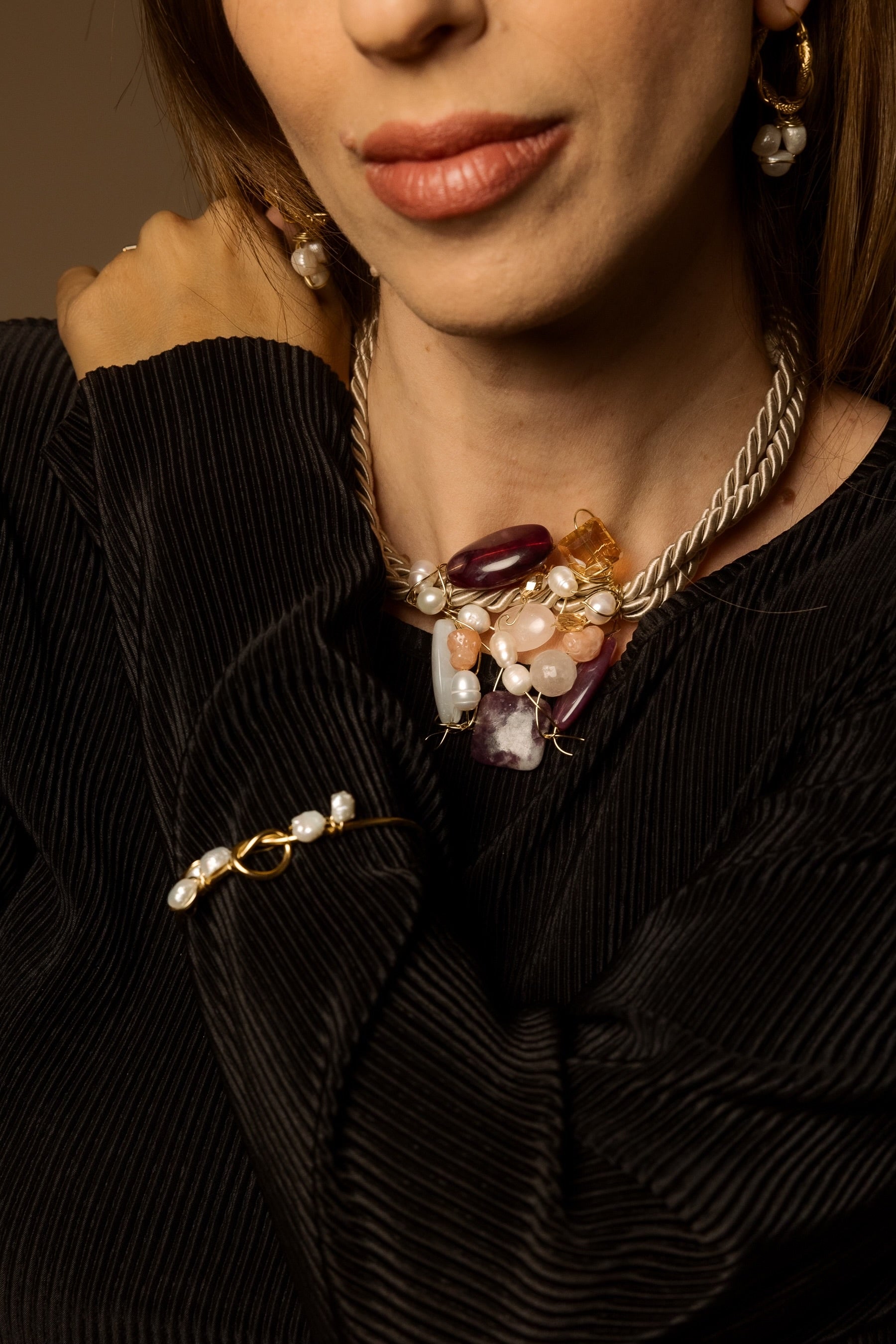 The Rose Petal Statement Necklace is a unique accessory featuring freshwater pearls and rose quartz, elegantly arranged with pink tones on a taupe rope. This one-off piece enhances any outfit, providing a sophisticated aesthetic that complements various styles, making it suitable for both casual and formal occasions.