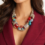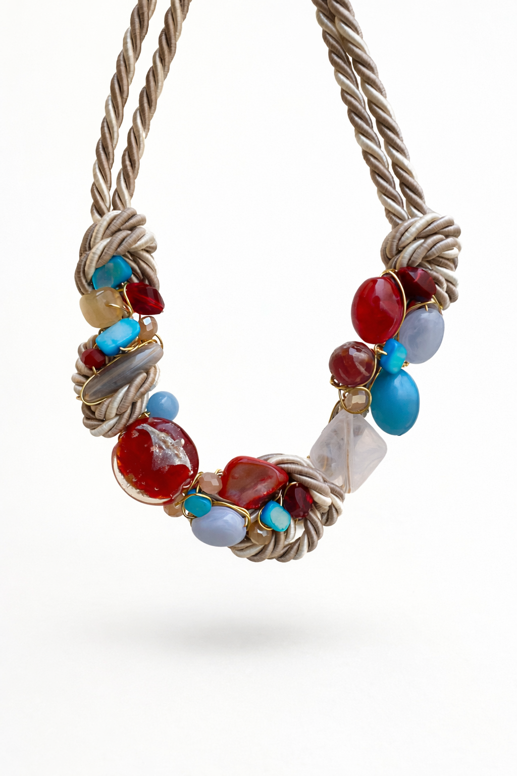 The Rubine Riveria necklace features a taupe rope design combined with vibrant red and turquoise shades. This combination enhances visual contrast, making it a striking accessory. Its unique color palette allows for versatile styling, suitable for various occasions.