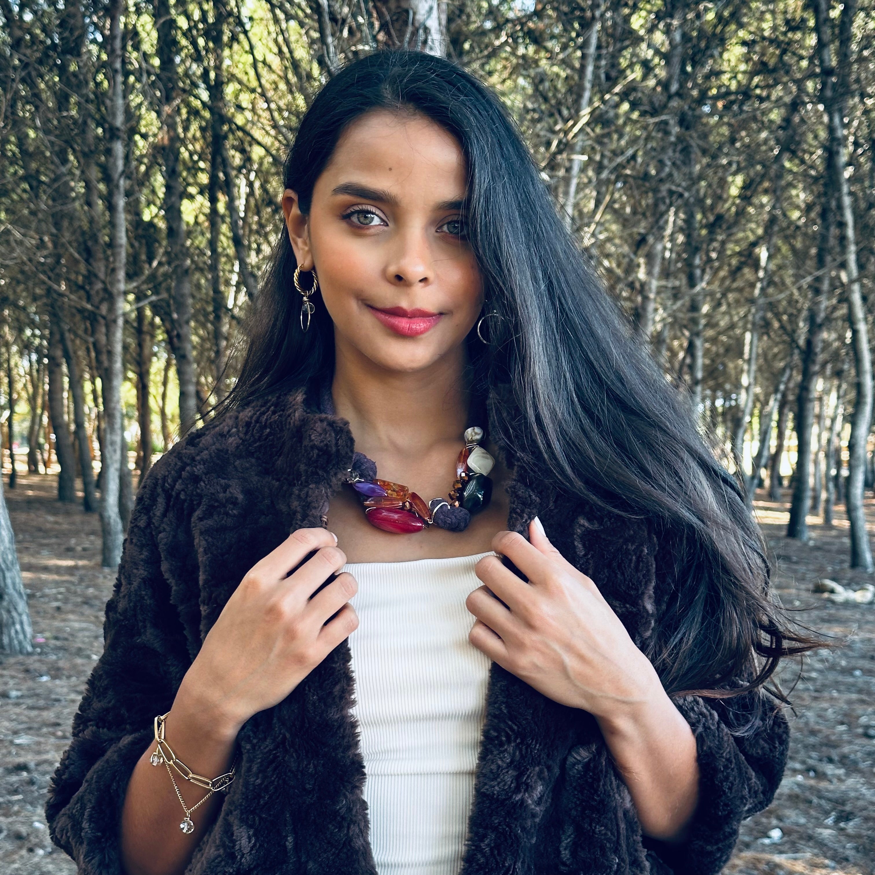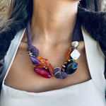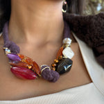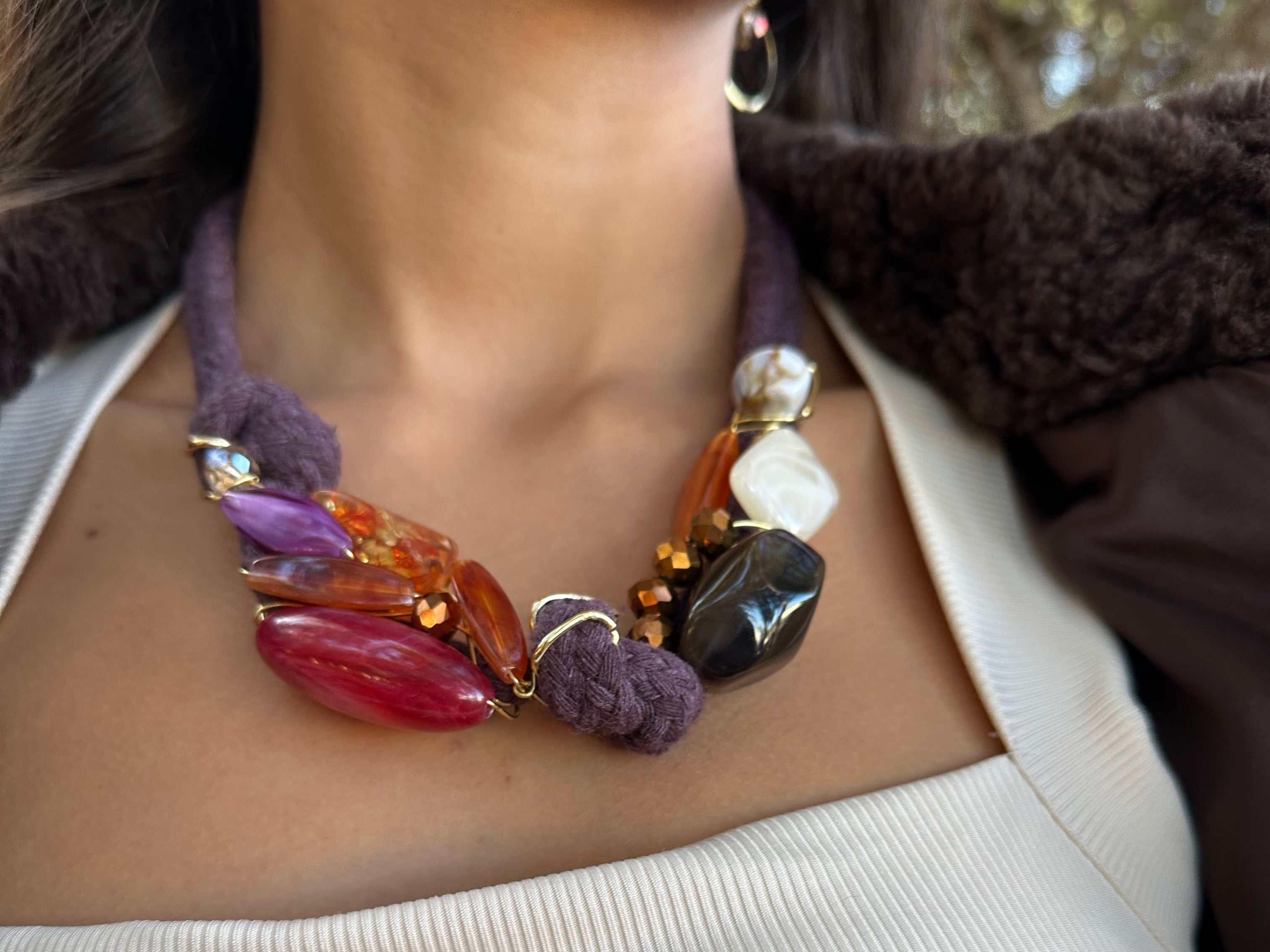 Experience the bold elegance of our Scarlet Aura Statement necklace. The vibrant amber red tones of this piece, combined with the deep purple soft rope, make for a striking addition to your jewelry collection. This necklace sits perfectly on your collar bone, making a statement that will elevate any outfit.