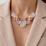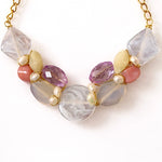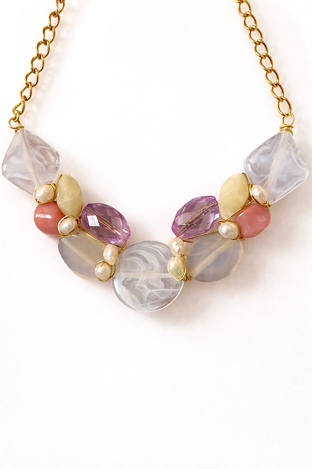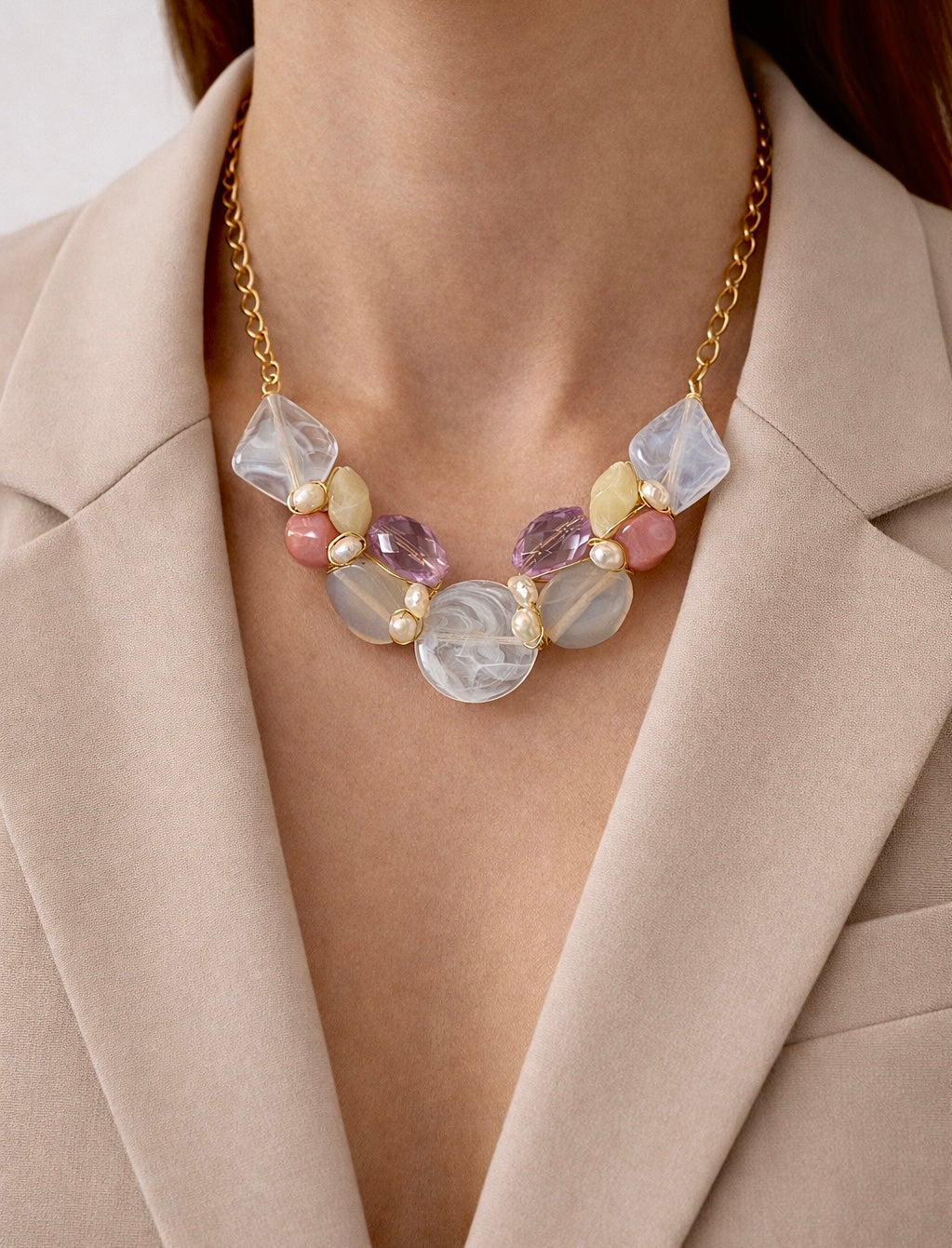 The Soft Aurora features a combination of soft pastel hues, including purple, white, beige, and soft pink, elegantly crafted in glass. This design is complemented by a durable stainless steel chain that is adjustable for a customized fit, providing both aesthetic appeal and versatility for various occasions.