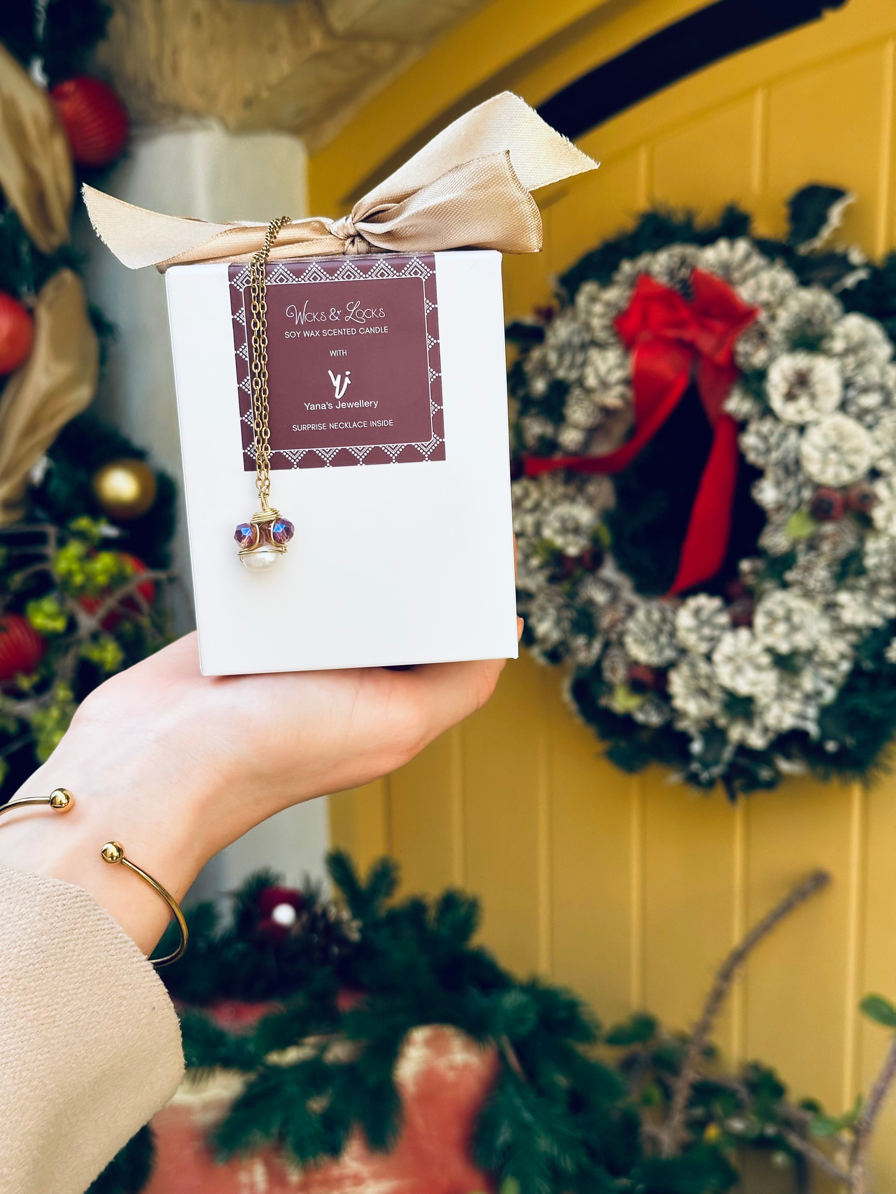 Hand-poured and hiding a handcrafted Yana’s Jewellery necklace inside. First the scent hits, then the sparkle. A gift that delivers the “wow” twice.