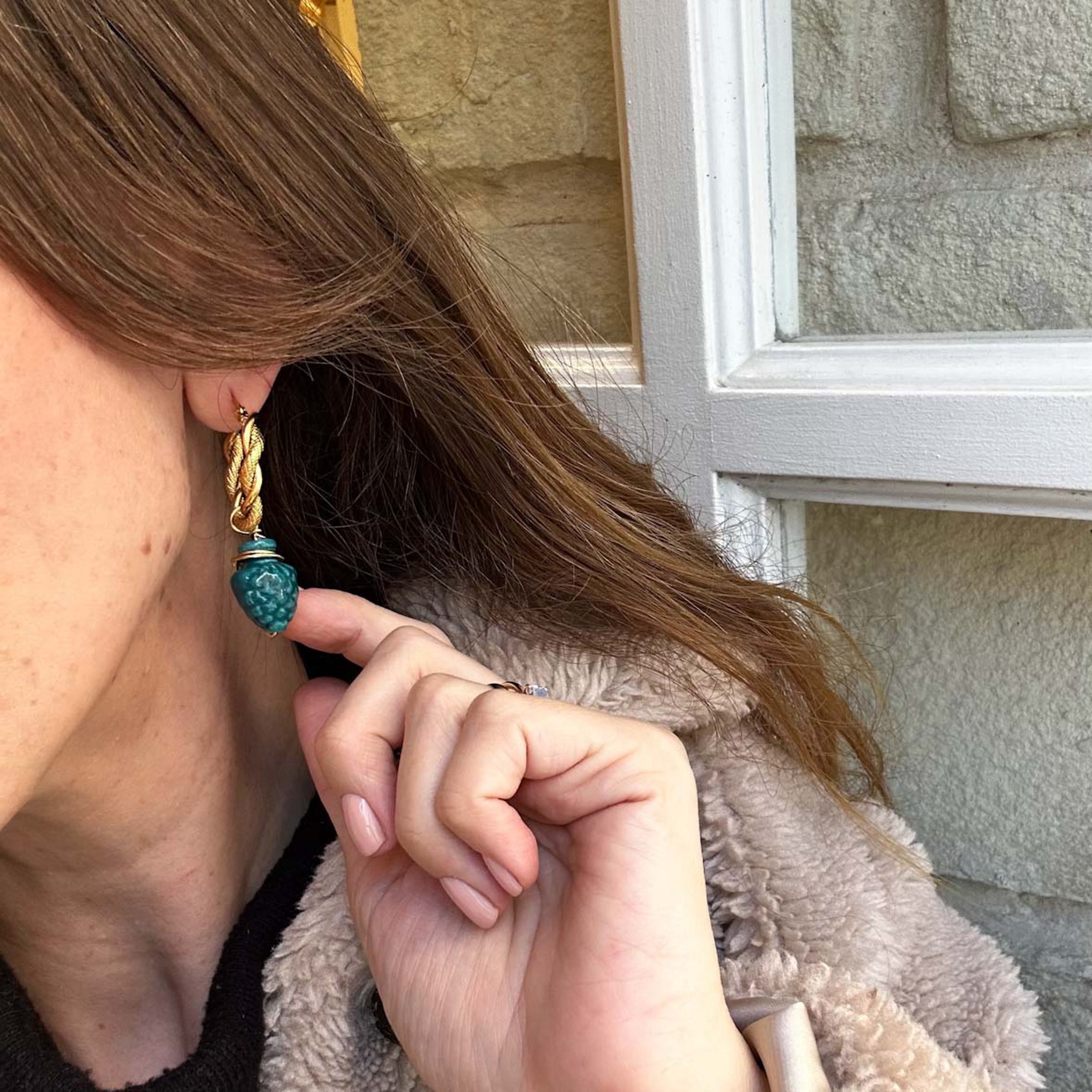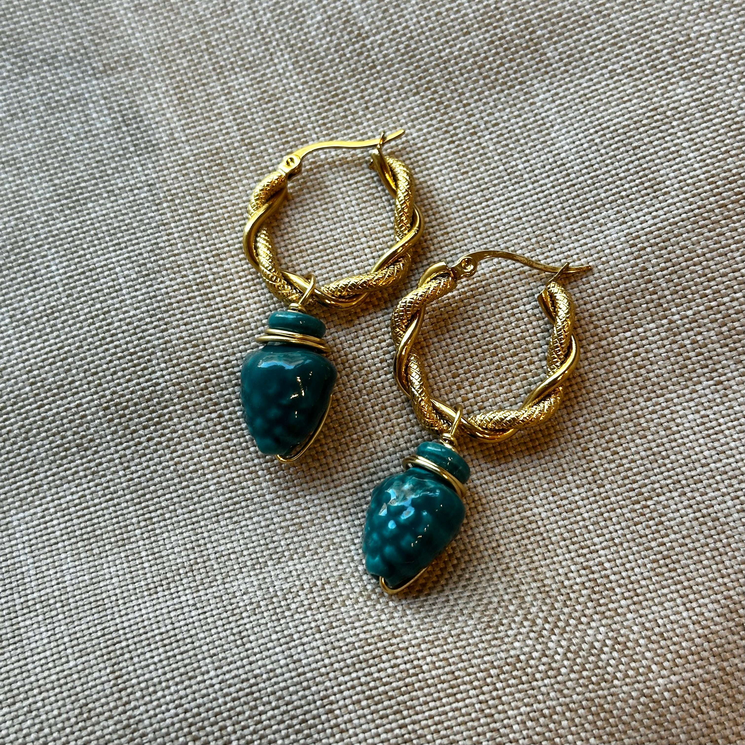 This Teal Ceramic Vase features a combination of sleek stainless steel rope hoop earrings and vibrant teal ceramic beads. The perfect blend of contemporary design and bold color, these earrings are sure to add a touch of style to any outfit. Expertly crafted with high-quality materials, these earrings are a must-have for any fashion-forward individual.