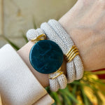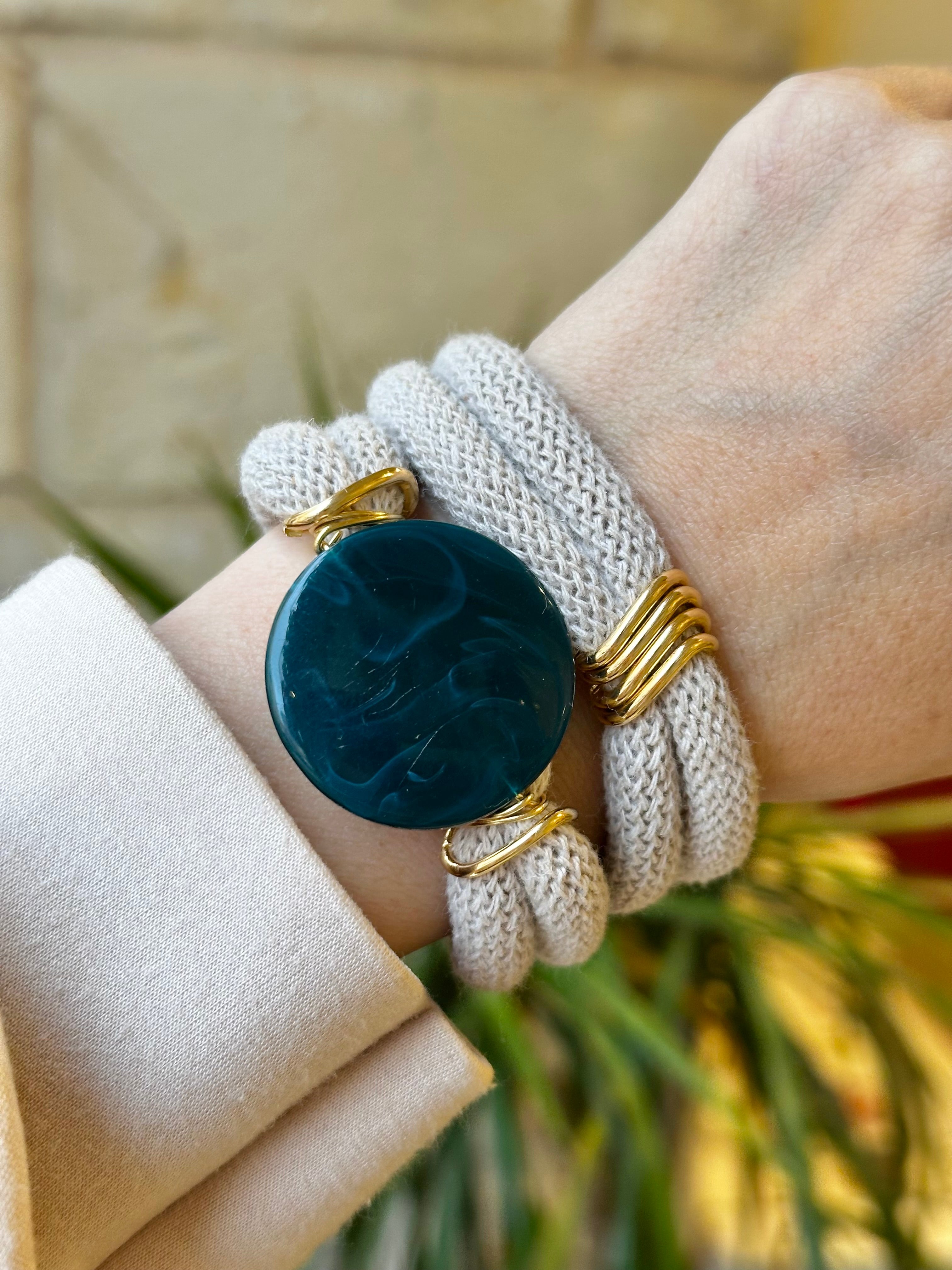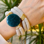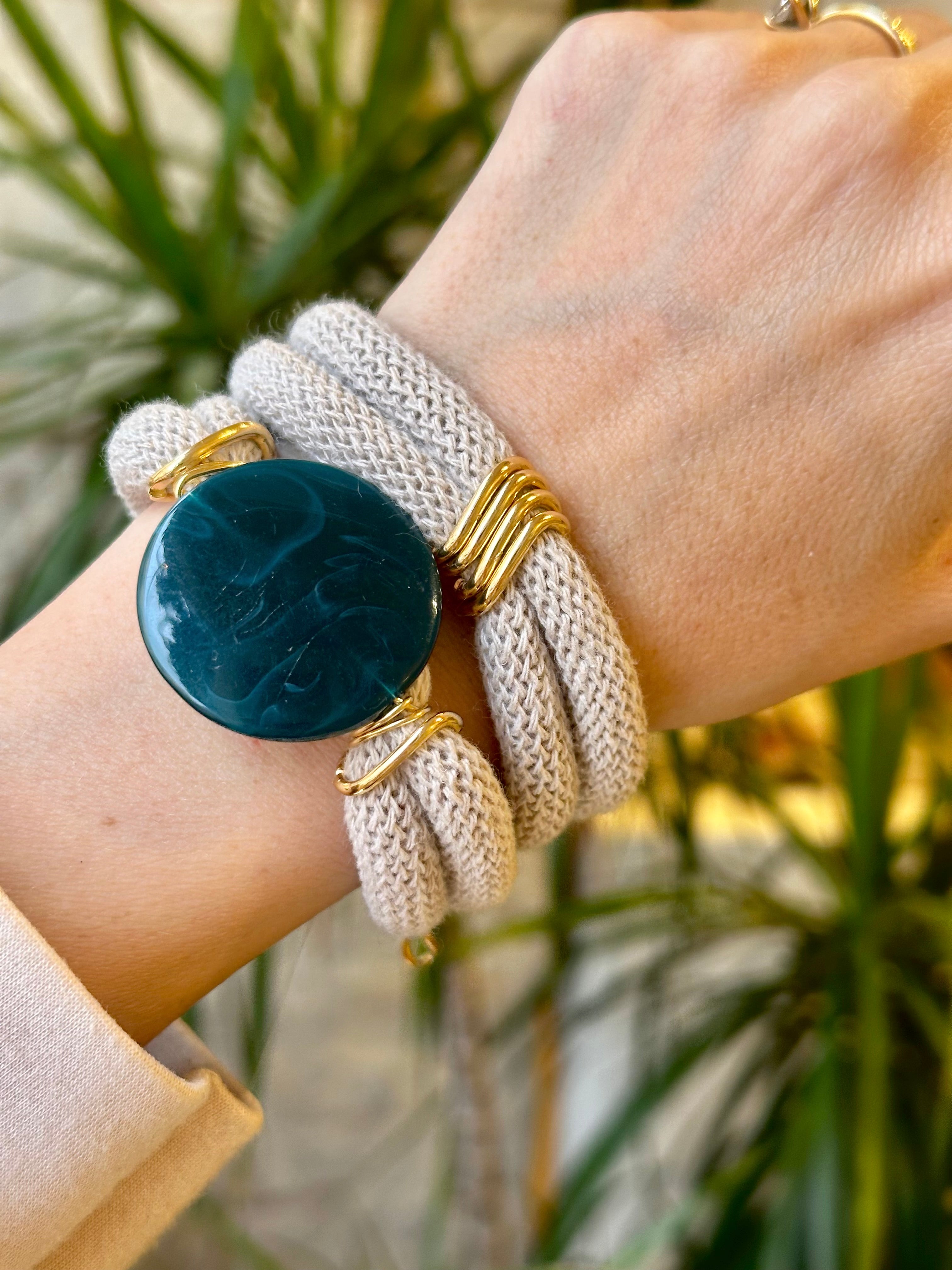 This teal disc wrapover bracelet on beige cotton rope is the perfect accessory for any outfit. The wrapover design allows for a customizable fit while the chain link adds a touch of elegance. Adding both style and comfort to your wardrobe, this bracelet is a must-have.